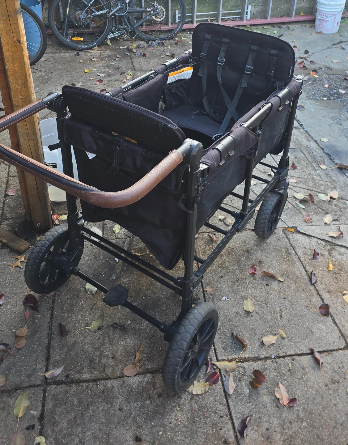 I'm selling a black wagon stroller. It looks like it's in good condition and ready for some fun outings with the little ones! It features a comfortable seating area with safety straps and sturdy wheels for easy maneuvering
