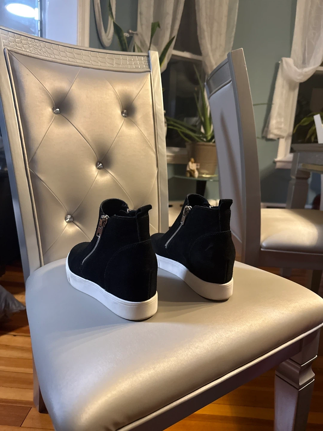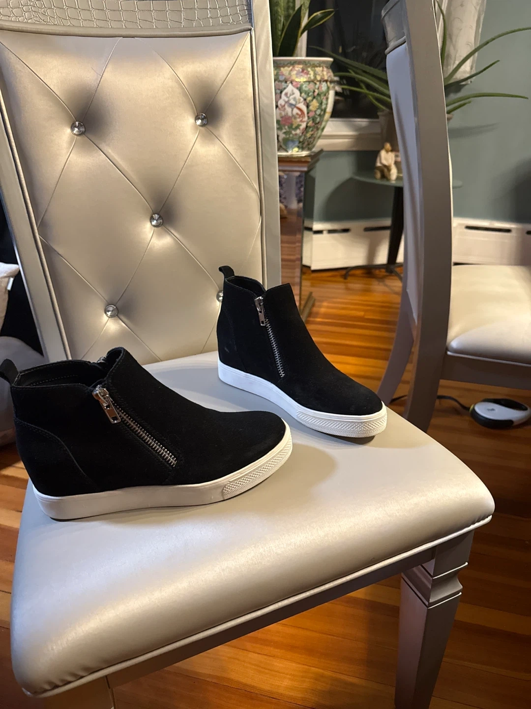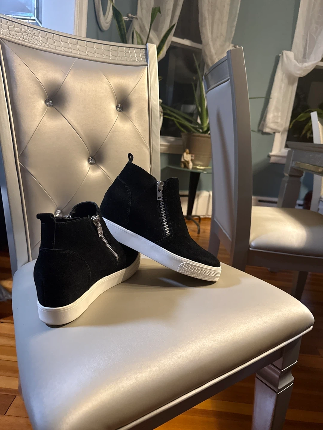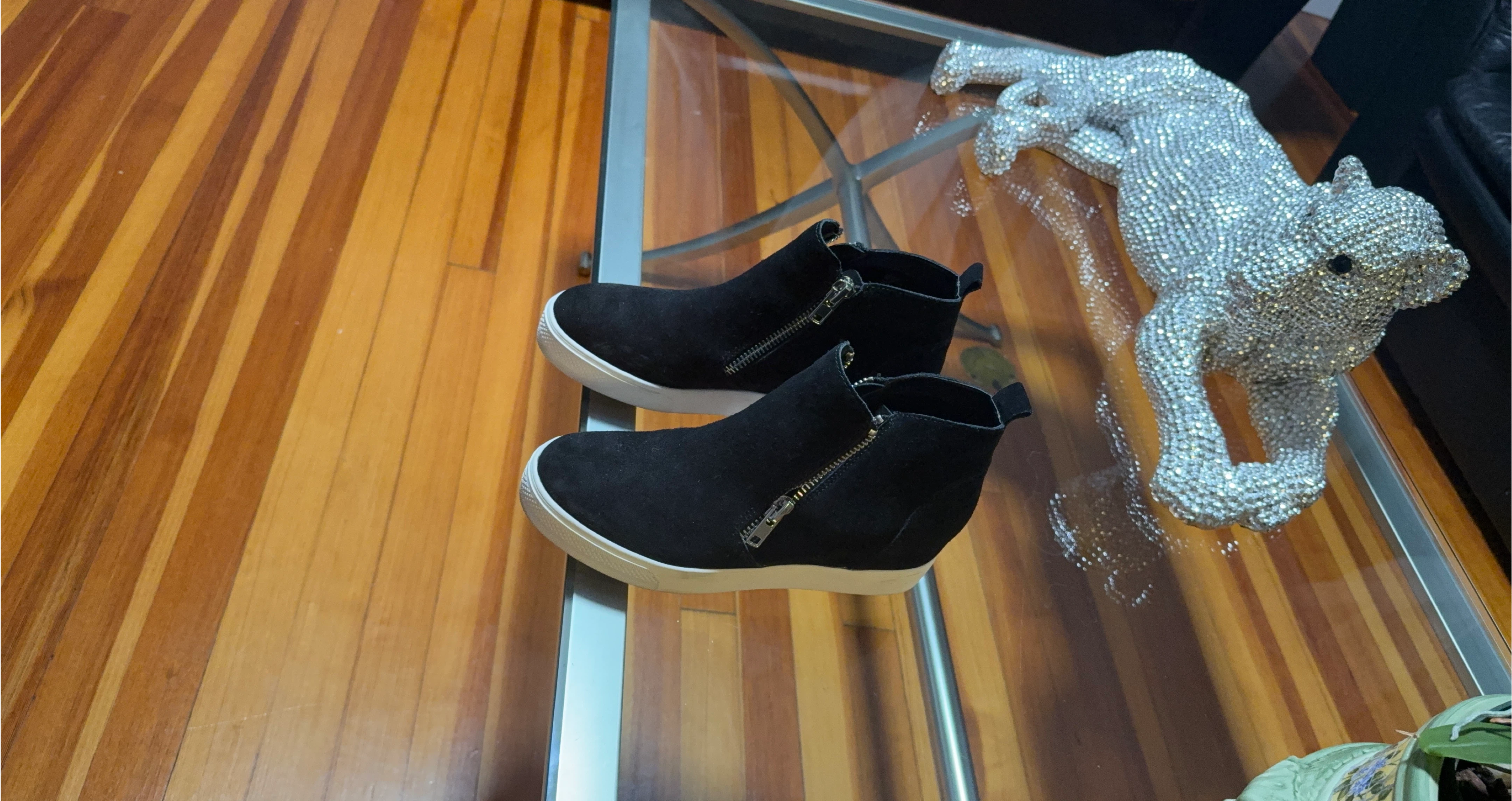 Cute black wedge ankle booties with a zipper on the side. They have a white sole. Great for fall and winter!