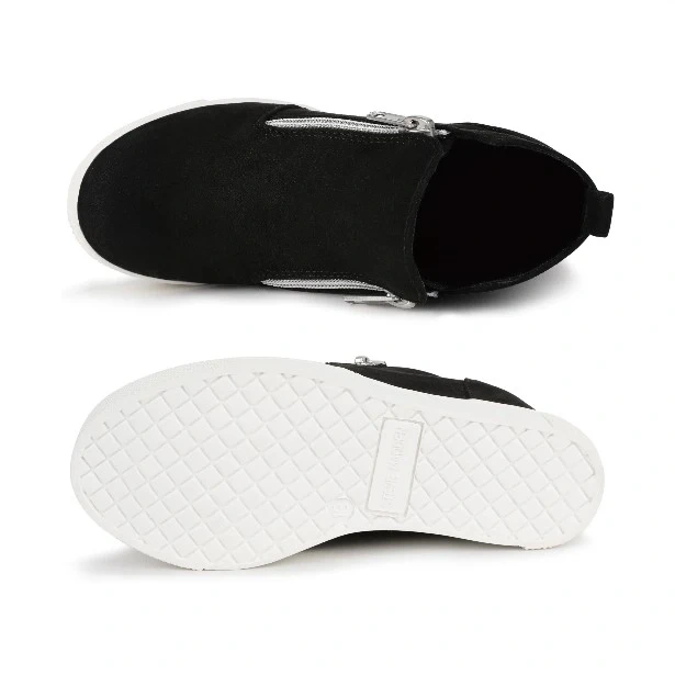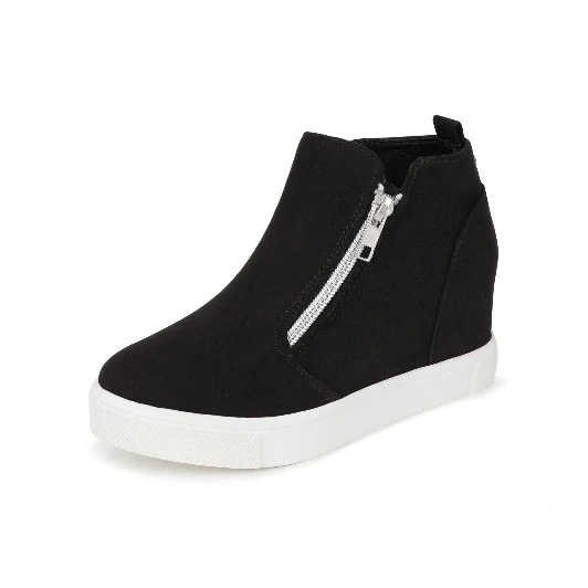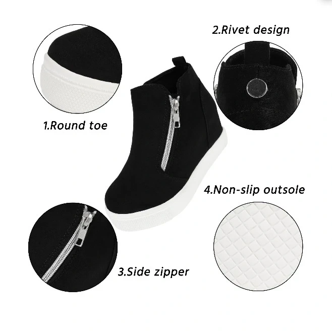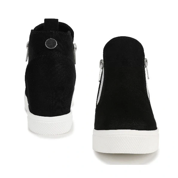 1000+Cute black wedge heel sneakers with a side zipper design! They have a round toe and a non-slip outsole. The wedge heel is hidden and measures 1.57 inches, with a 0.79-inch platform. US size 1 UK size 13 EU size 32