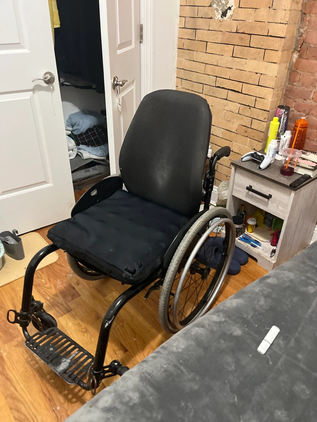 10Selling a black wheelchair. It has a padded seat and back for comfort. The frame is black, and the wheels are in good condition. It's a practical mobility aid for anyone who needs it
