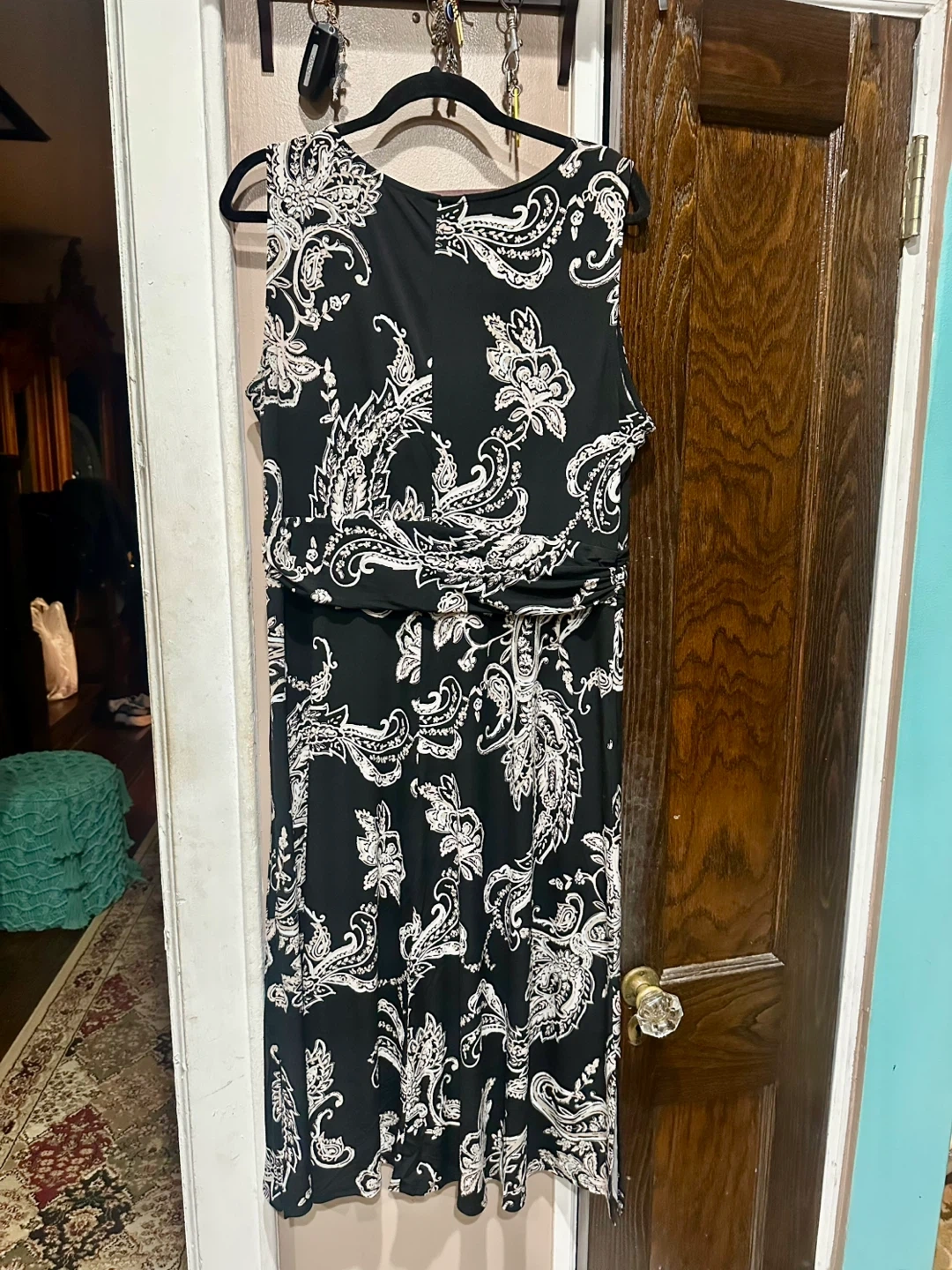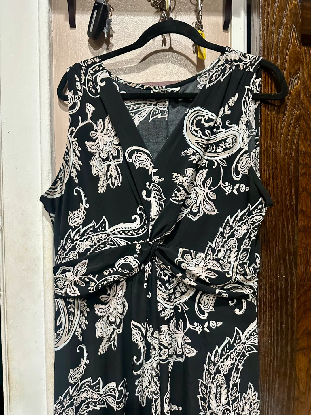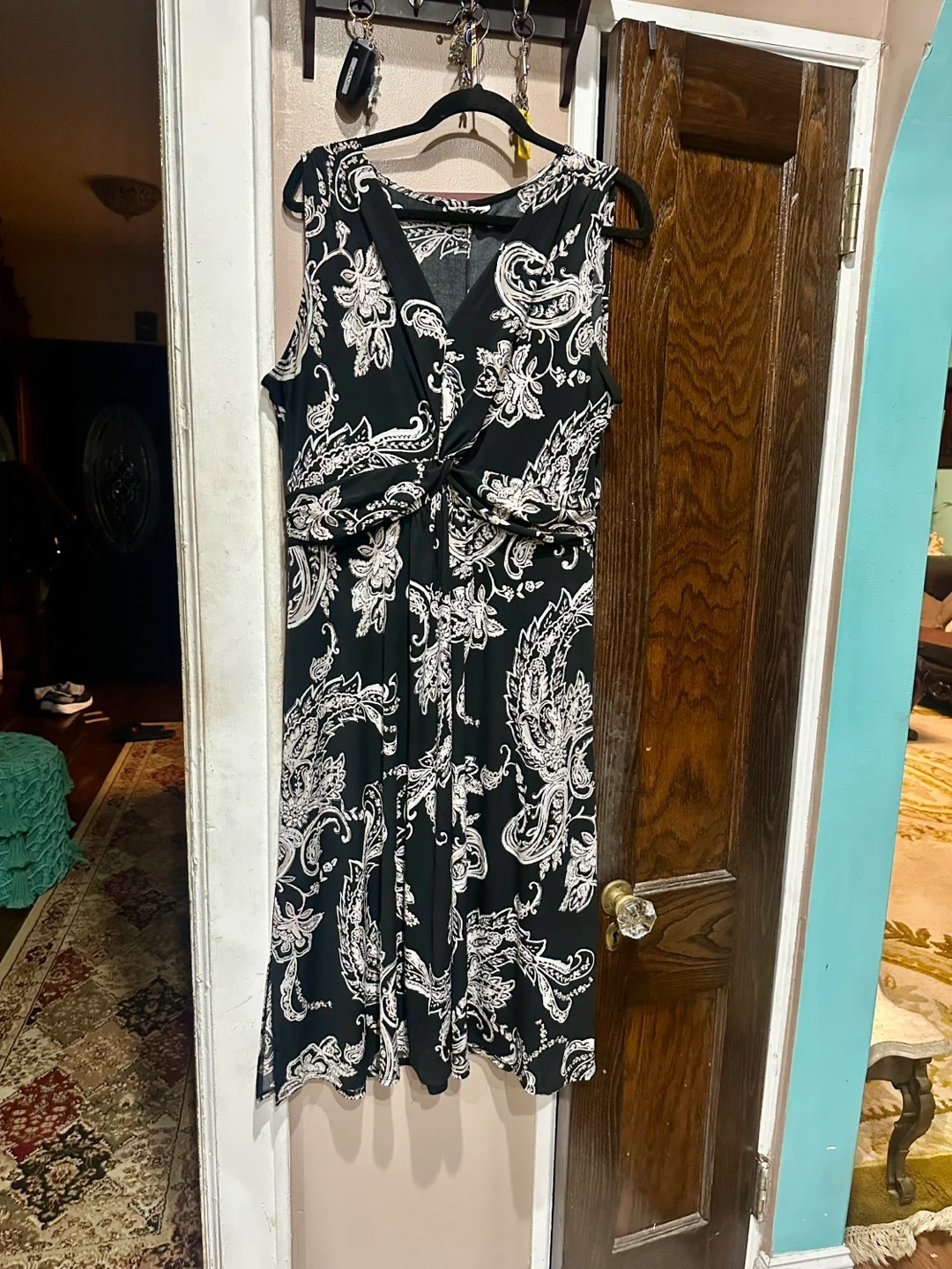 This is a dress in black and white. It has a pretty paisley pattern and a flattering knot detail at the waist. It's in great condition and ready for a new home!