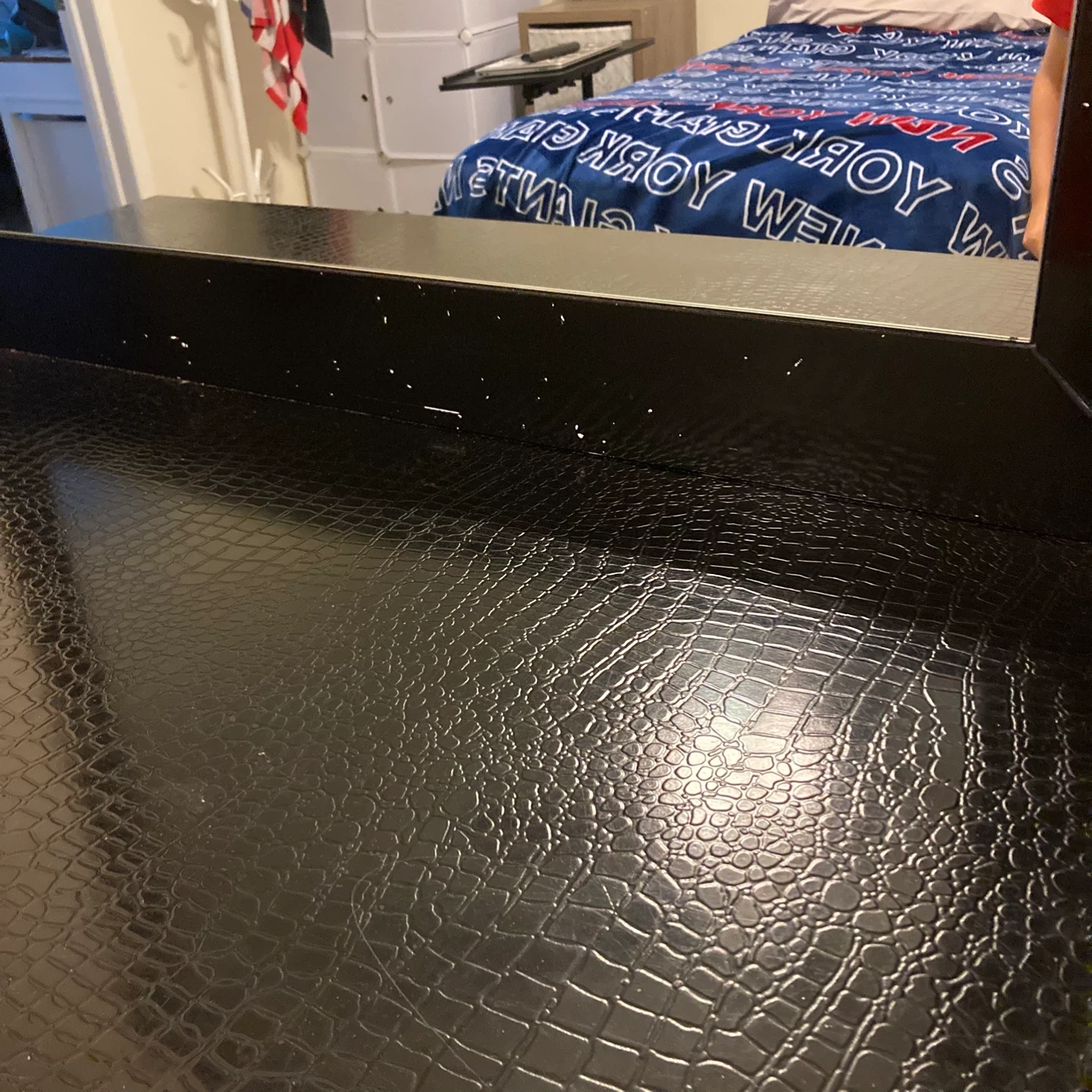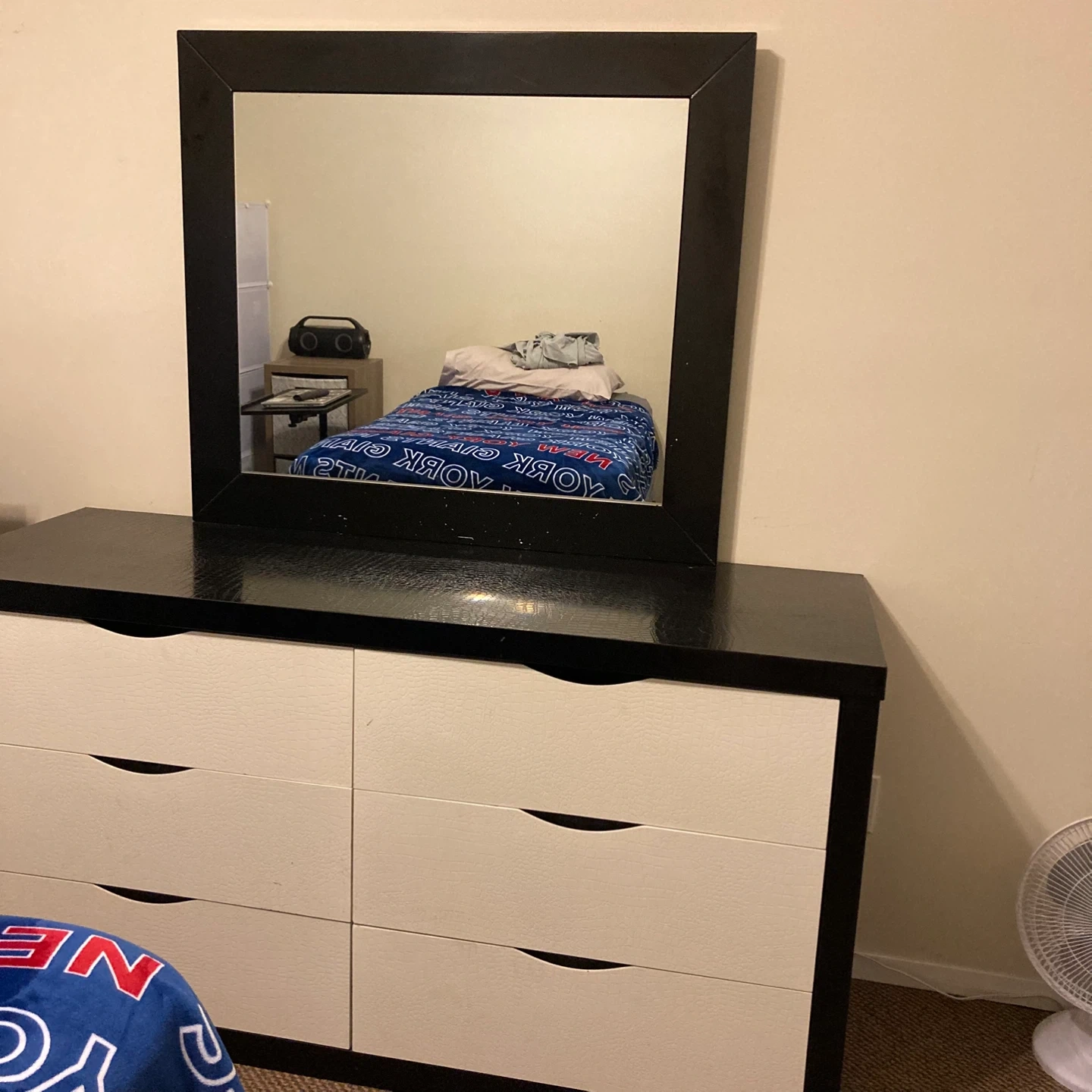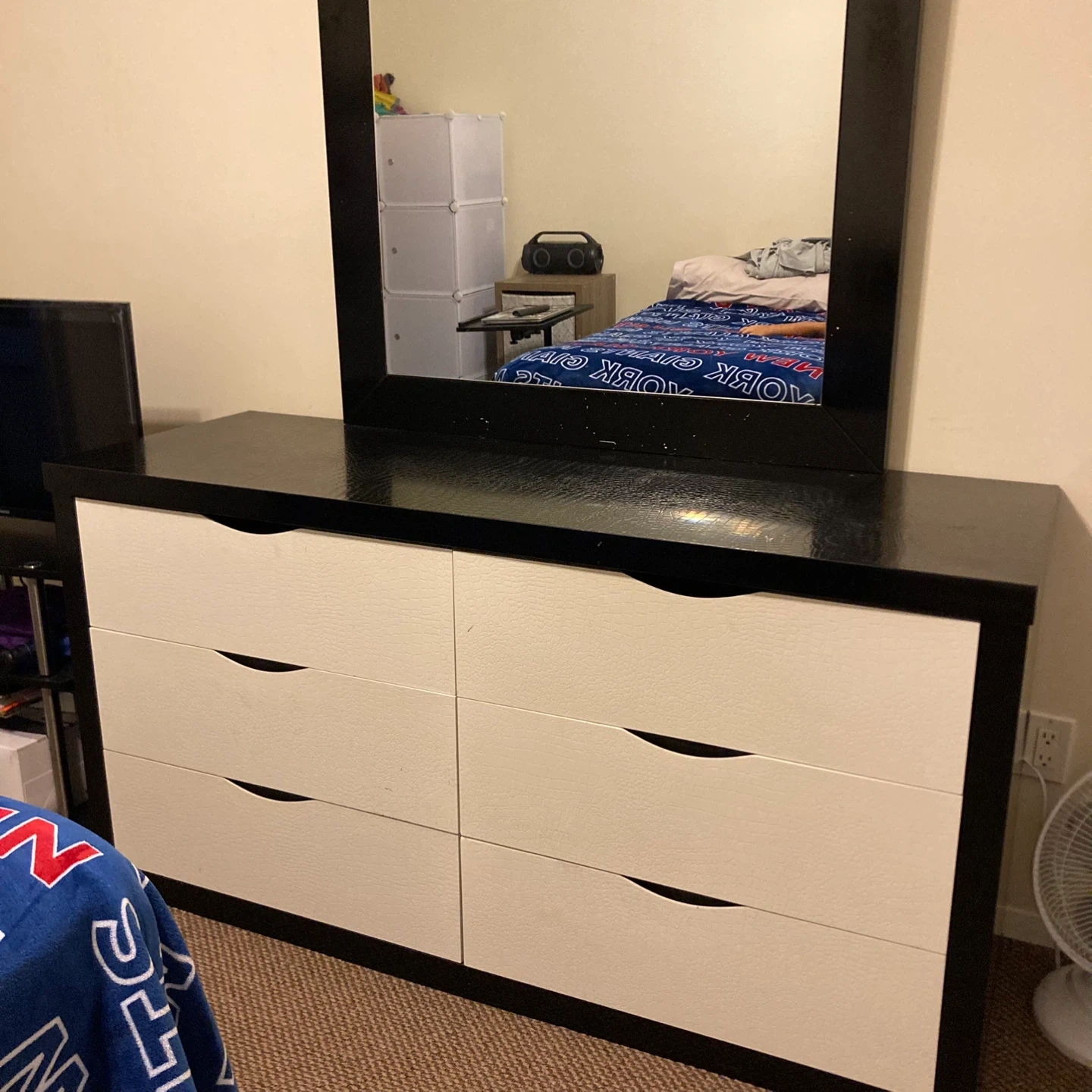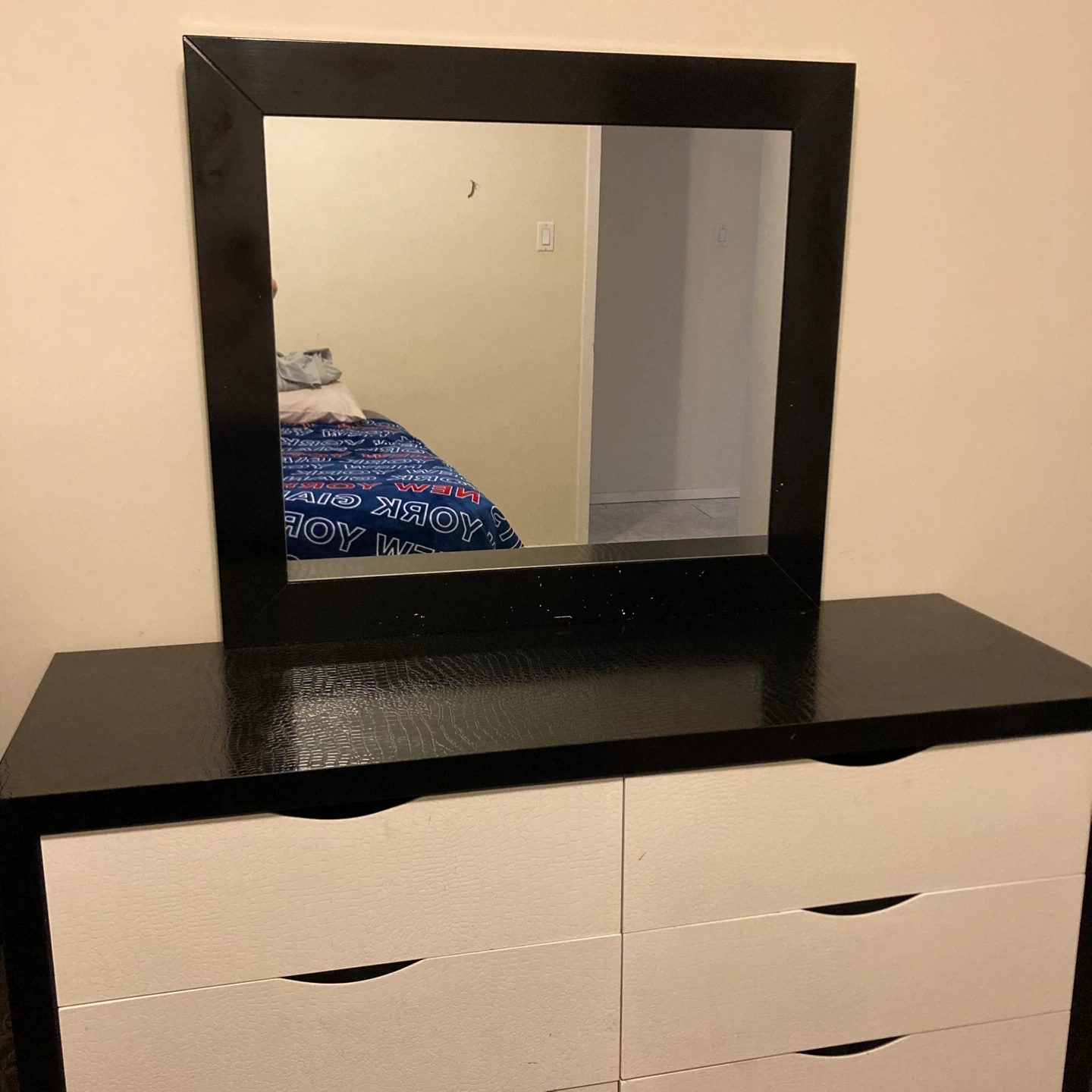 Selling a dresser with a mirror! It has a black frame and a white drawer front. The top of the dresser has a black, textured finish. Great for adding storage and a stylish touch to any room