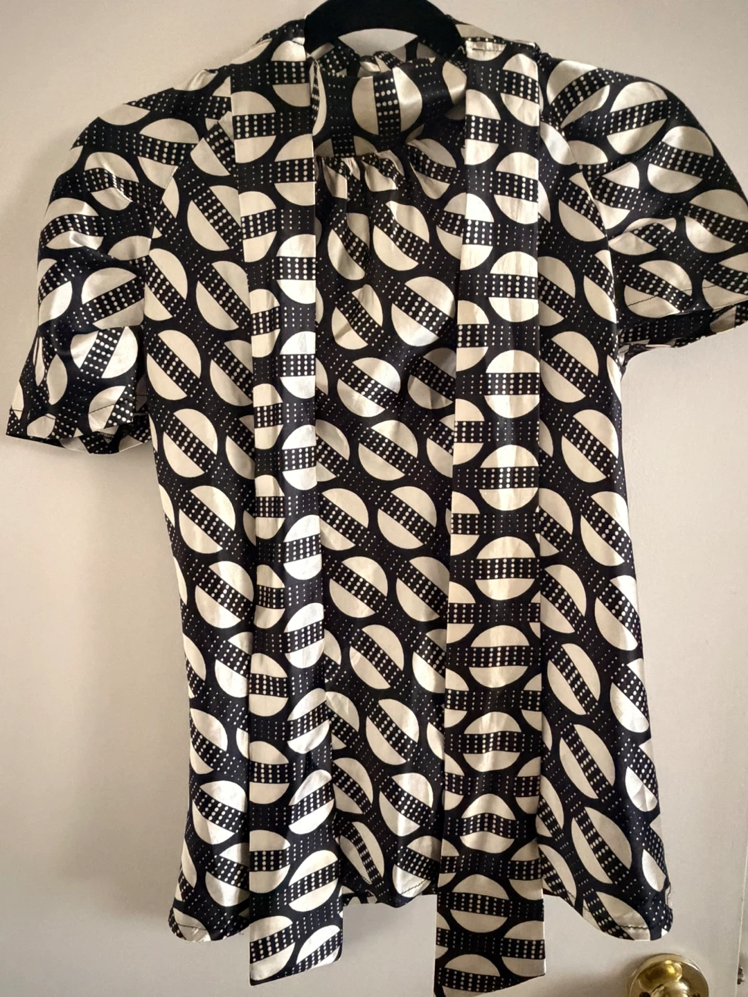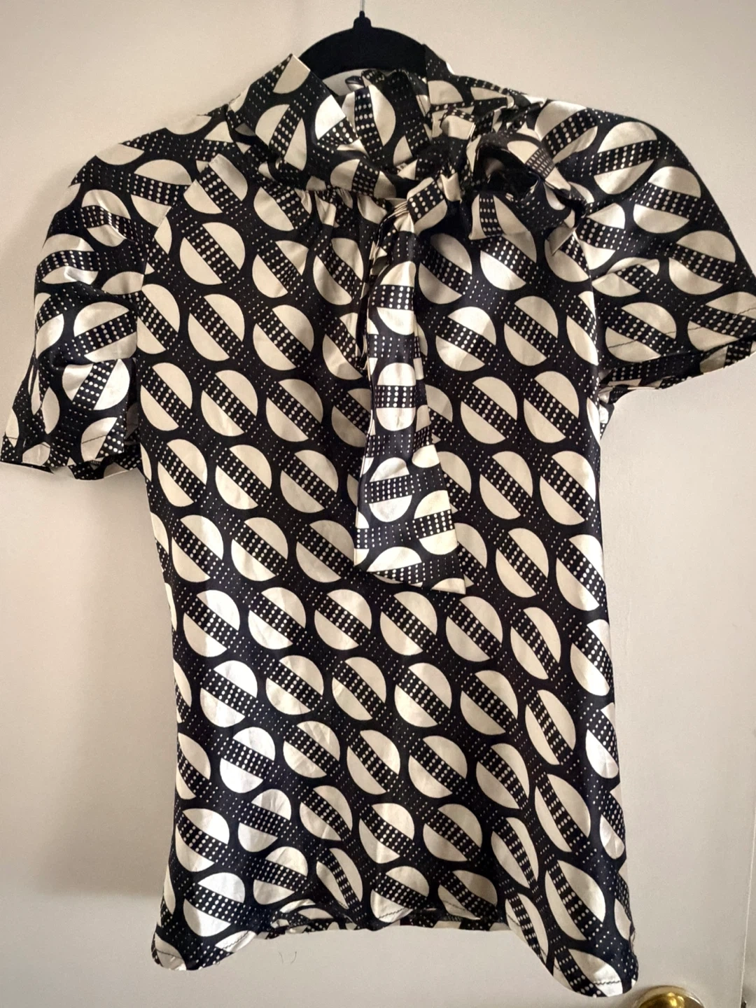 65This is a stylish black and white patterned blouse that's sure to make a statement! It features a unique design and a comfortable fit. Perfect for adding a touch of flair to any outfit