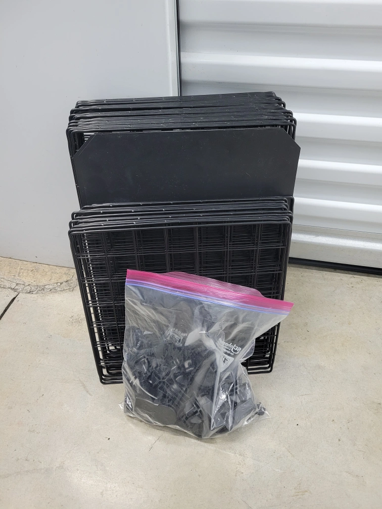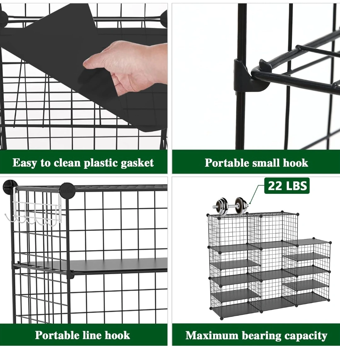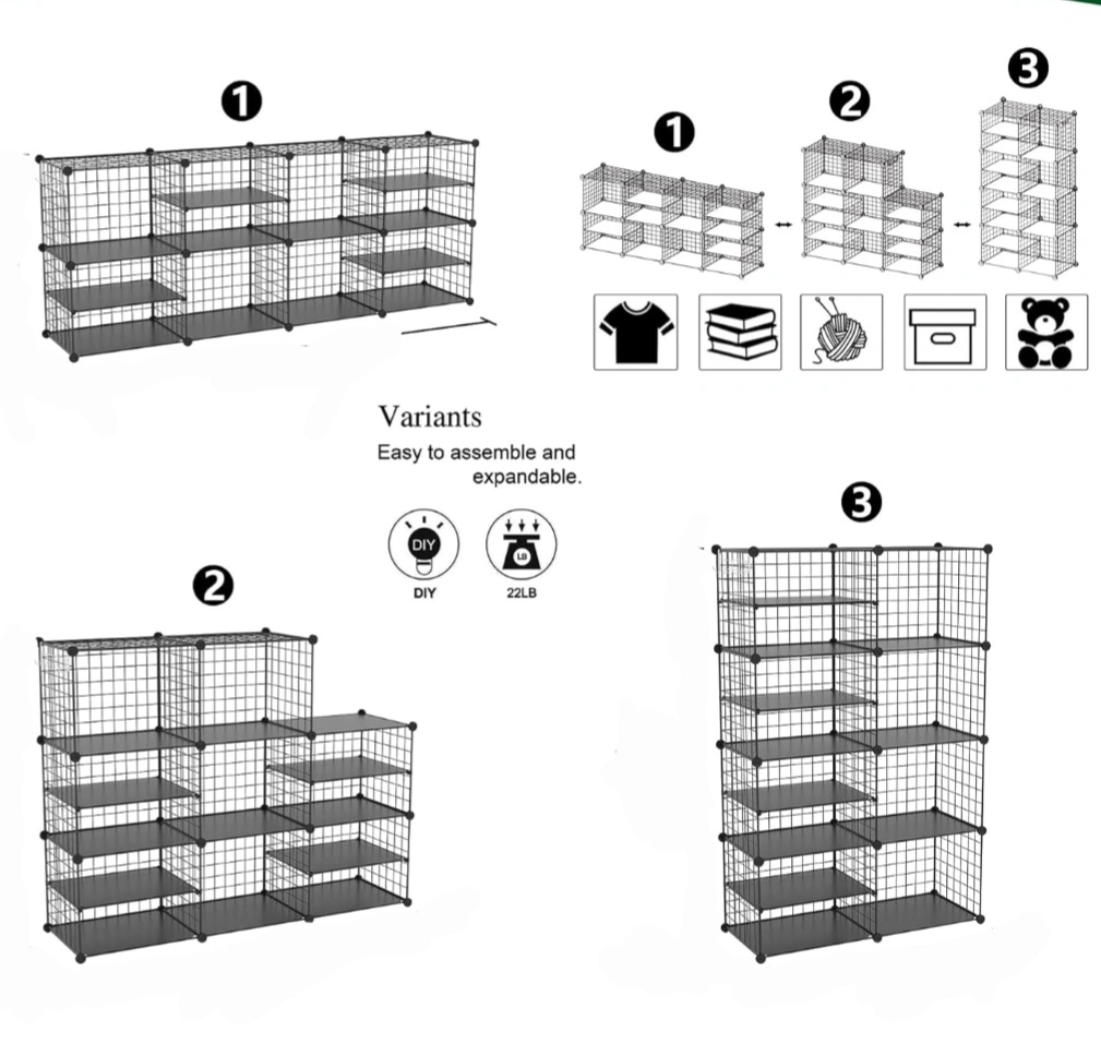 92This black wire cube storage organizer is perfect for decluttering! It's easy to assemble and expandable, with a maximum bearing capacity of 22 lbs. The plastic gaskets are easy to clean. As you can see in the pictures, you can assemble different design options. The lot includes: 11 3/4×11 3/4 - 13 pieces 11 3/4×15 3/4 - 21 pieces 13 pieces of gaskets You can count the connecting elements in the photos.