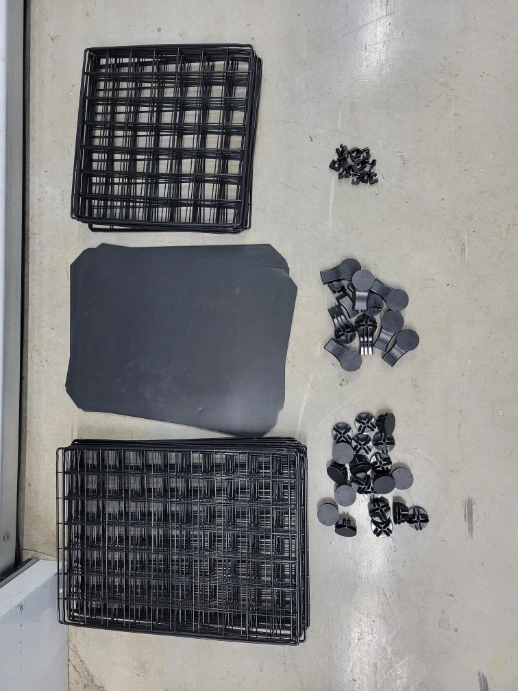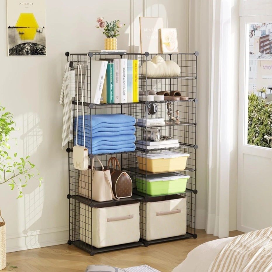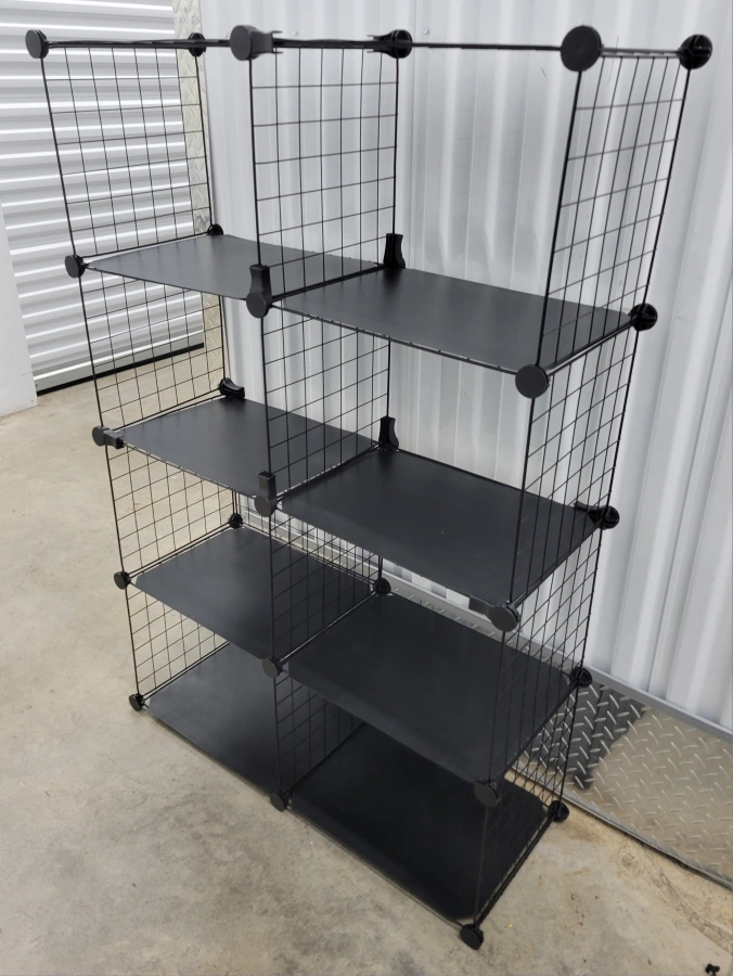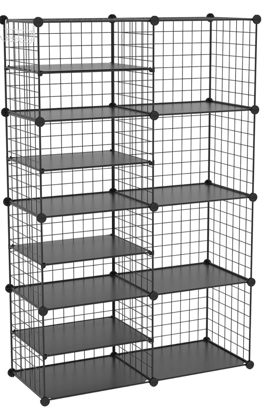92This black wire cube storage organizer is perfect for decluttering! It's easy to assemble and expandable, with a maximum bearing capacity of 22 lbs. The plastic gaskets are easy to clean. As you can see in the pictures, you can assemble different design options. The lot includes: 11 3/4×11 3/4 - 13 pieces 11 3/4×15 3/4 - 21 pieces 13 pieces of gaskets You can count the connecting elements in the photos.