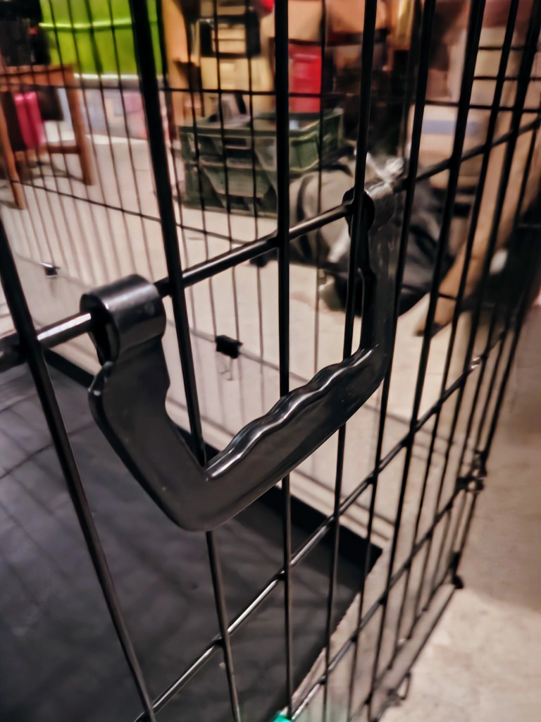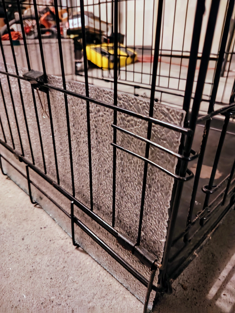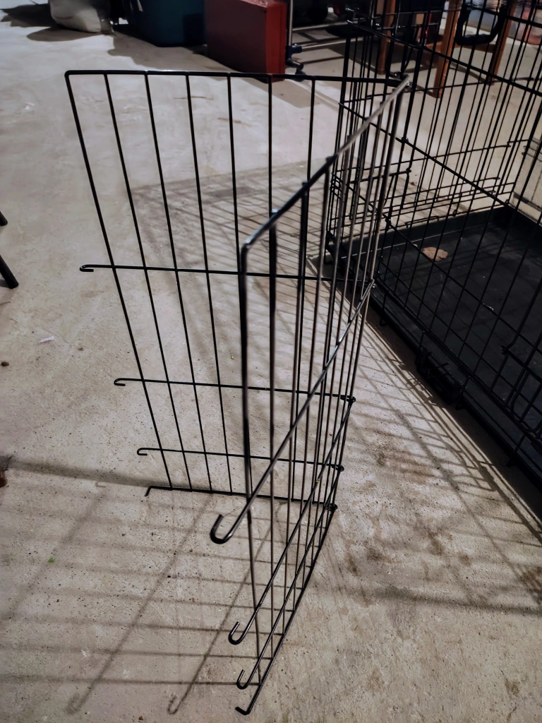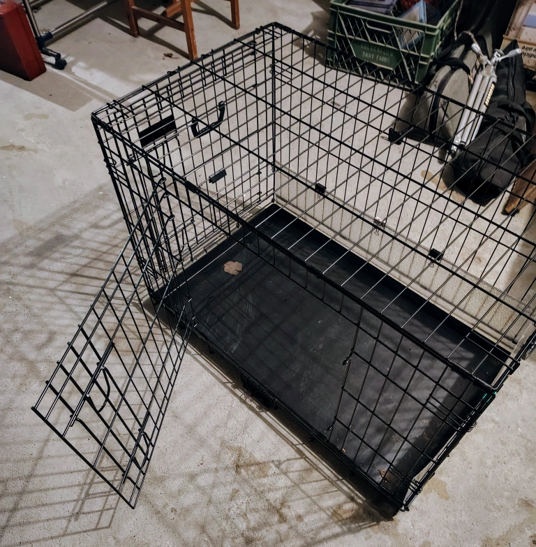 Selling a gently used black wire dog crate. It measures approximately: 3' x 2'. It's in good condition, and features a removable plastic tray for easy cleaning and wrap around screens to minimize splashes. In addition, it comes with a collapsible sub-floor. The crate has 2 doors with secure latches, and convenient carrying side handles. Perfectly fits a medium size dog.