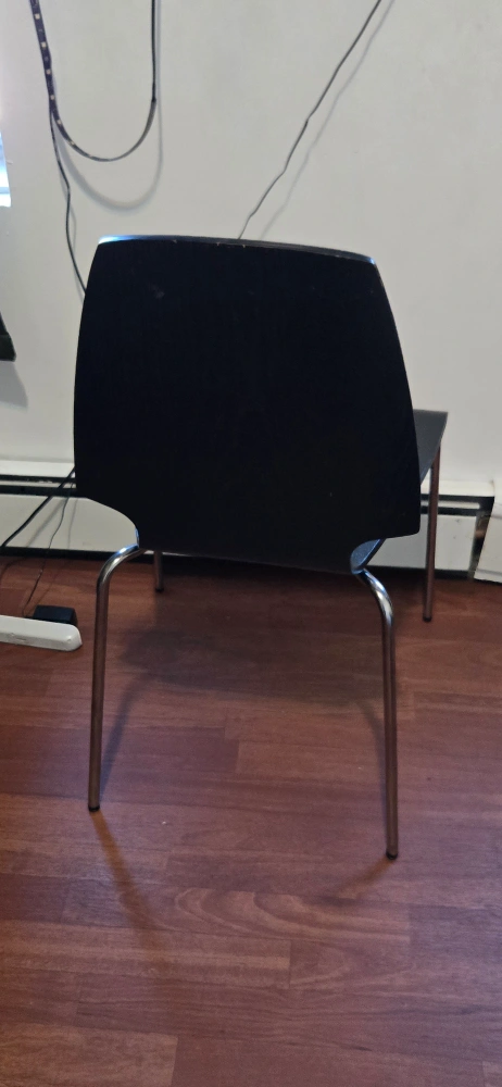 22Here's a stylish black wood chair with a sleek chrome frame! It's in great condition and would look perfect in any modern home. The chair is sturdy and comfortable, perfect for dining or as an accent piece