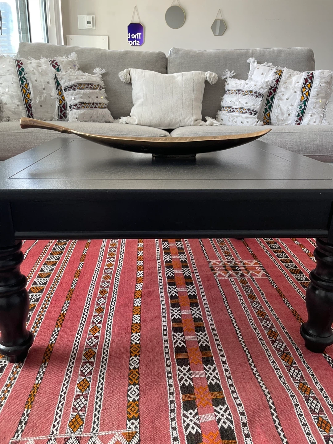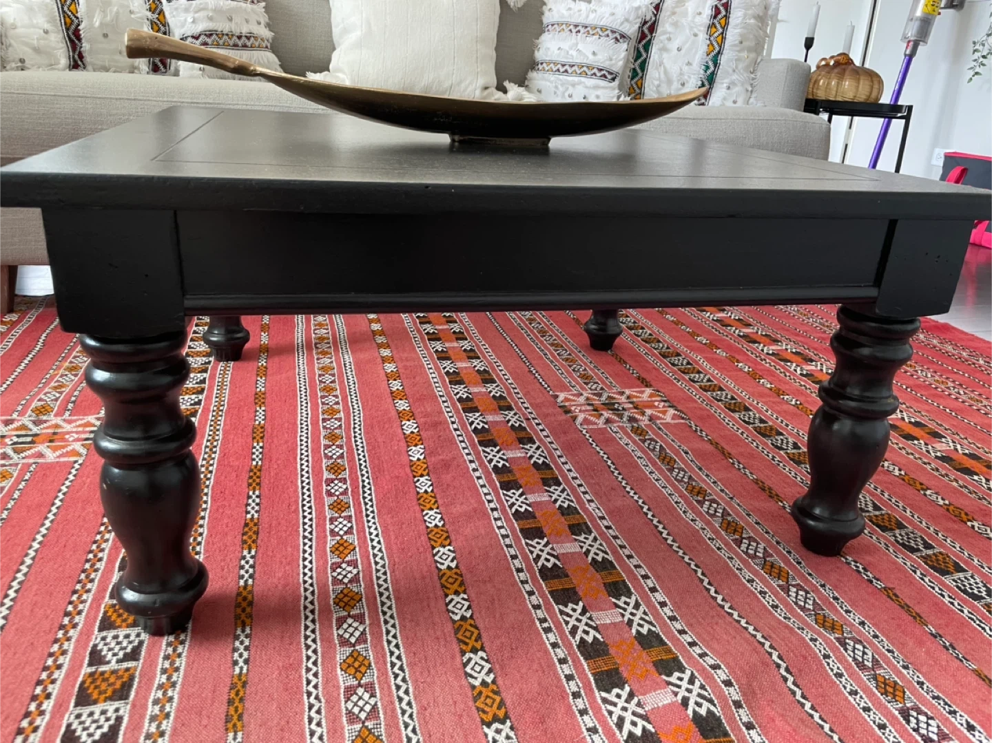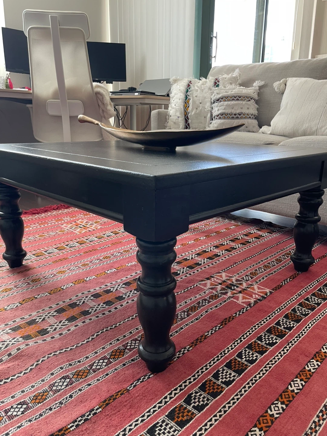 Here's a lovely black wood coffee table that would look great in any living room! It's sturdy and in good condition. The table has a classic design with turned legs, adding a touch of elegance to your space