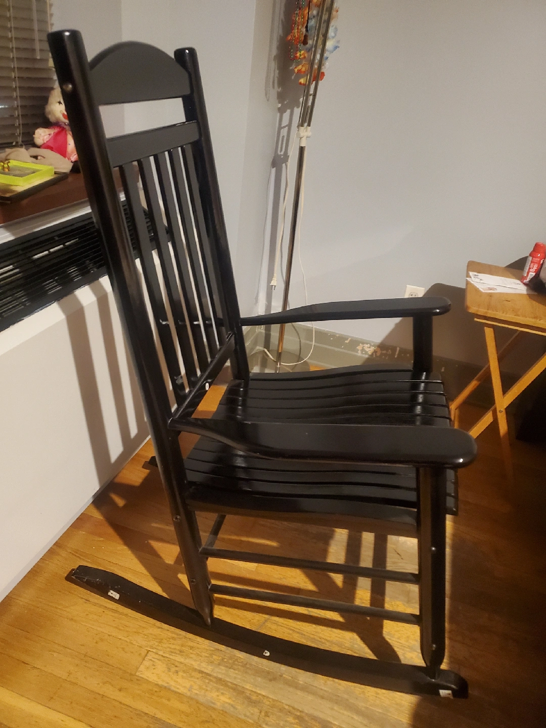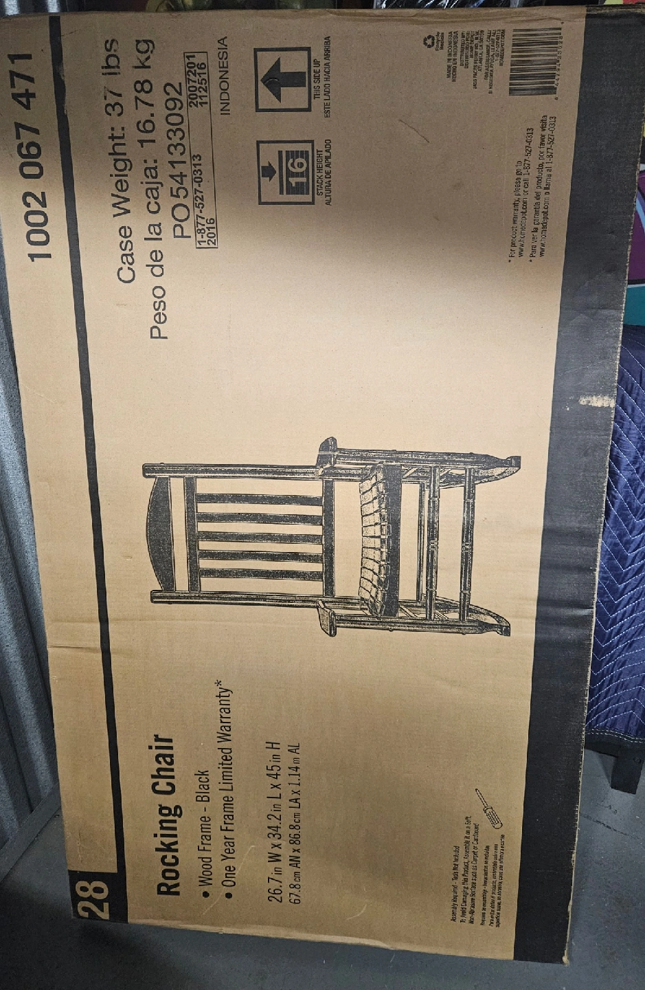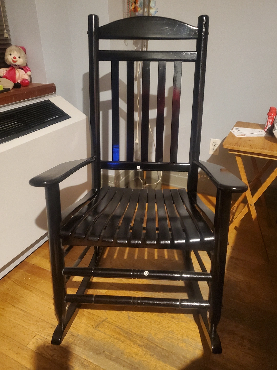 Selling a black wood frame rocking chair. It's in great condition and ready for a new home! The dimensions are 26.7 in W x 34.2 in L x 45 in H. It's a comfortable and stylish addition to any room. Brand new in the box.