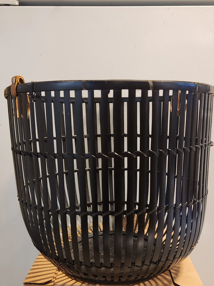 This is a black woven basket with leather handles. It's in great condition and ready for a new home. Perfect for storage or decor. 15.5" wide 14" tall