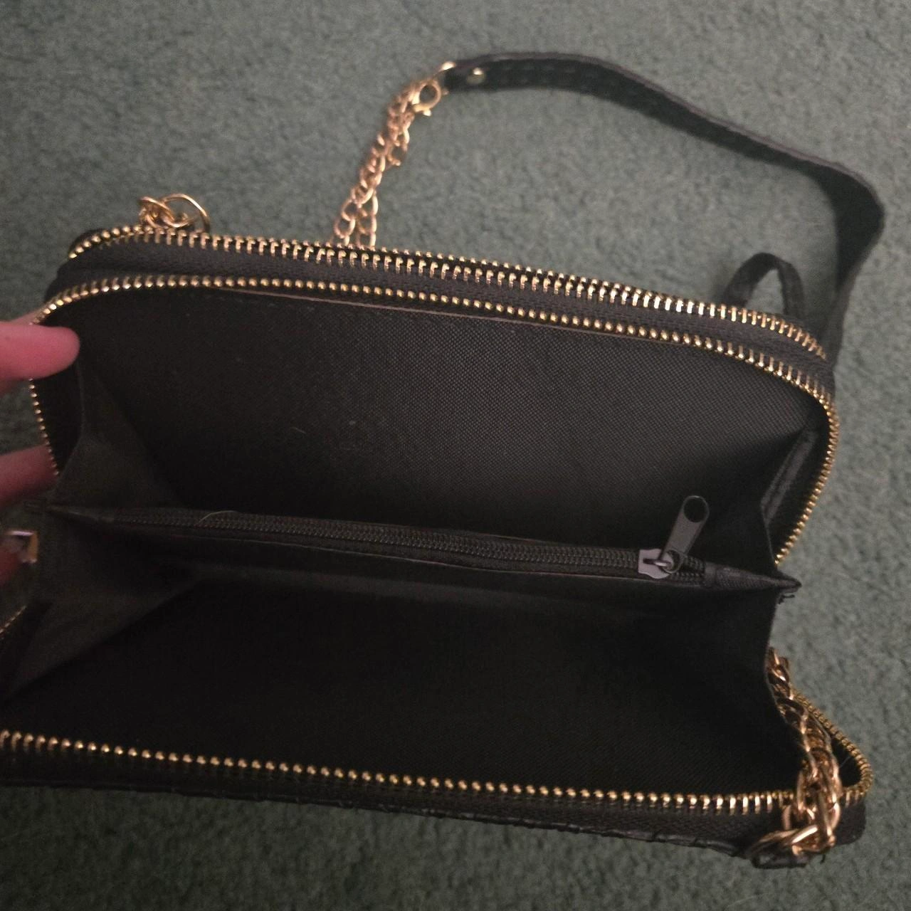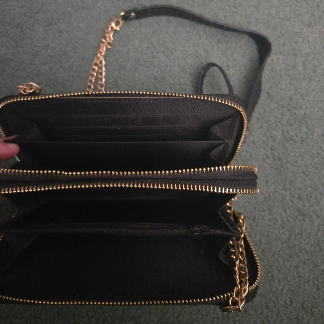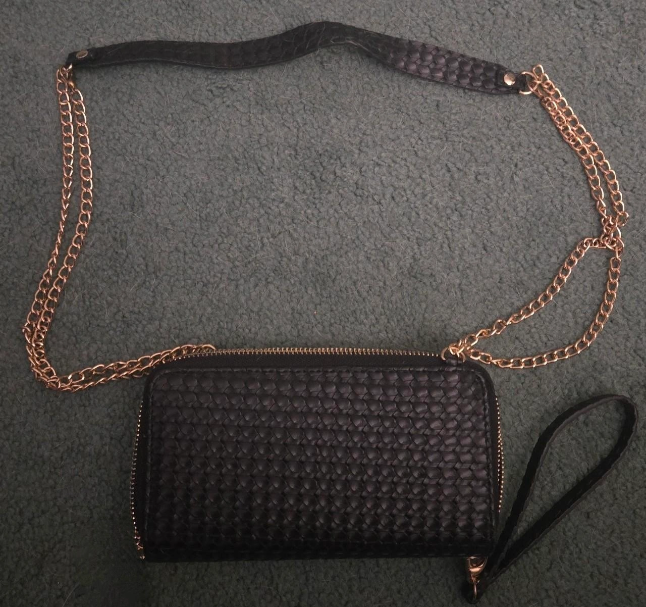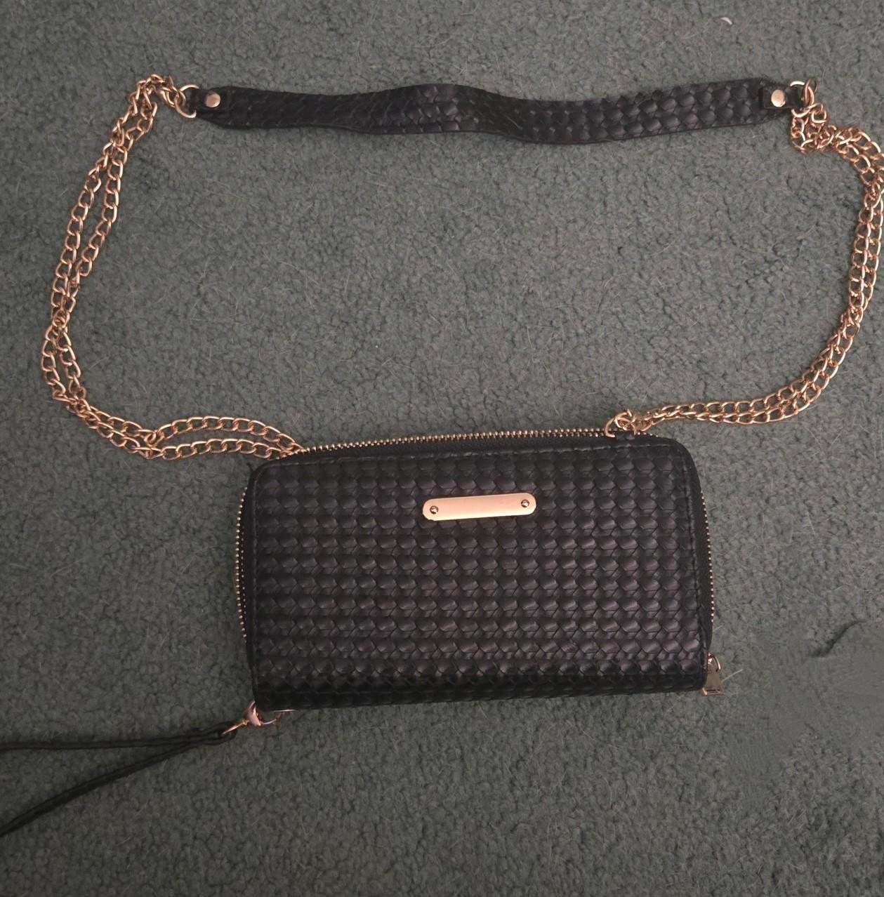 15Black crossbody wallet with gold chain strap. Features double zippers and multiple card slots. Woven textured material.