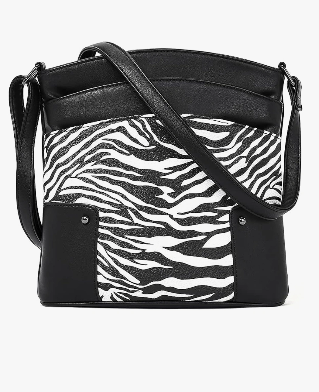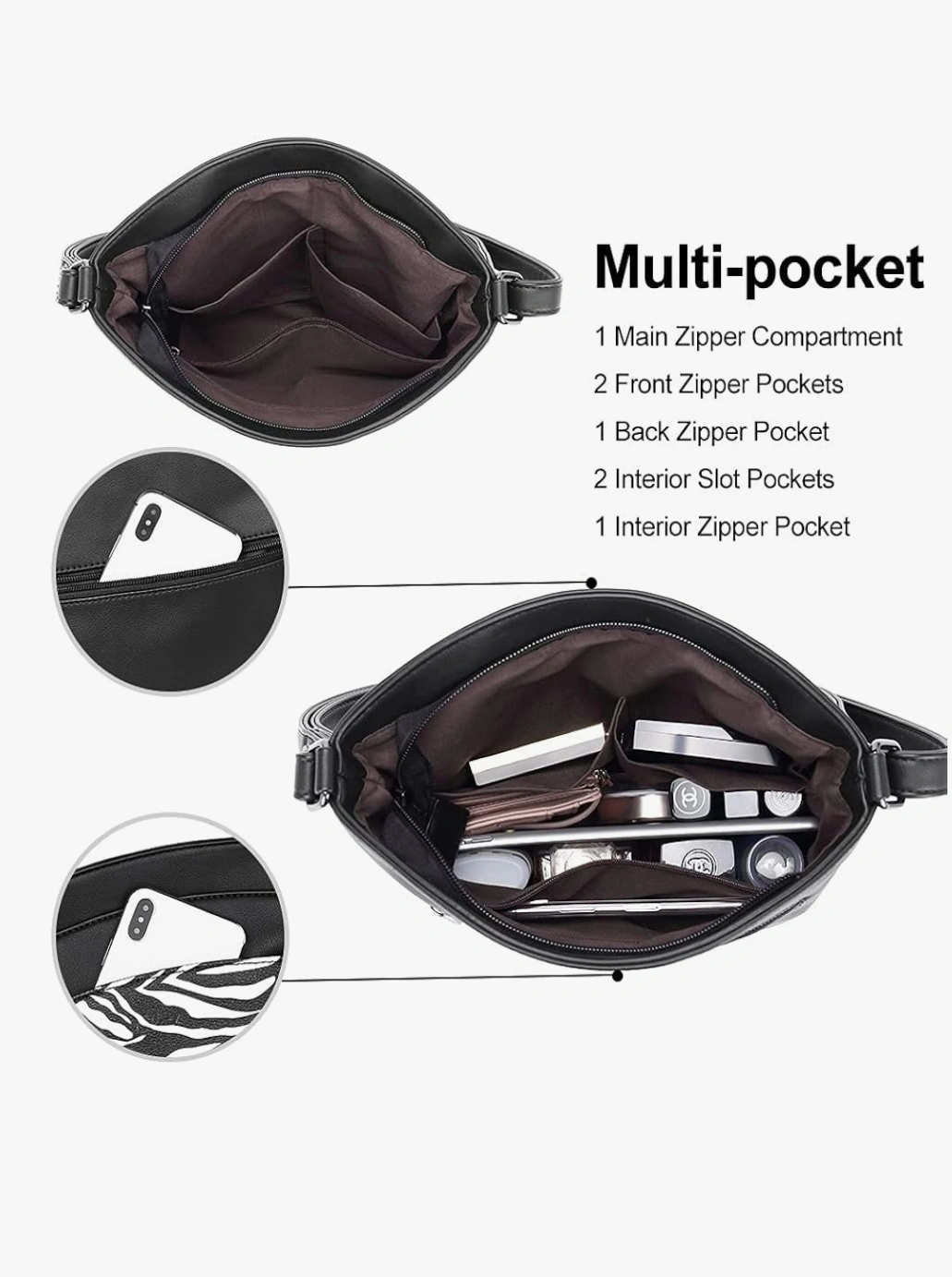 This black crossbody bag features a stylish zebra print design. It has a multi-pocket design, including a main zipper compartment, front zipper pockets, a back zipper pocket, and interior slot and zipper pockets. It's perfect for keeping your essentials organized while on the go
