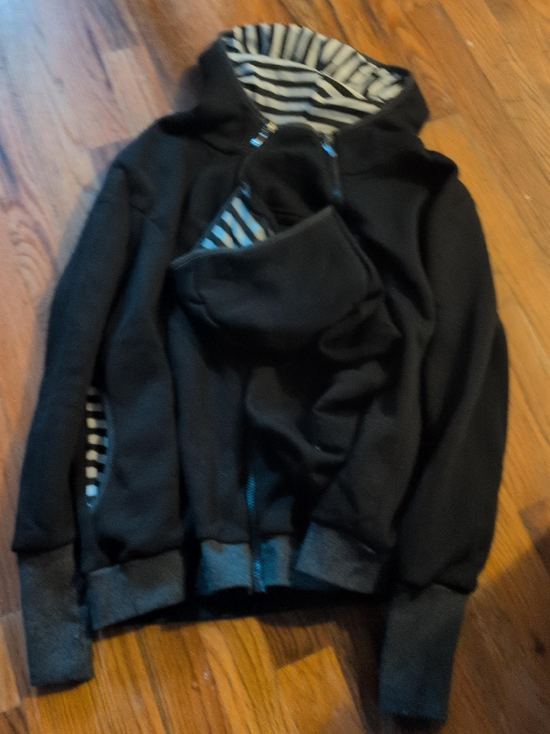 Black zip-up hoodie with a striped lining. It has a front pocket and is in good condition.. baby carrier