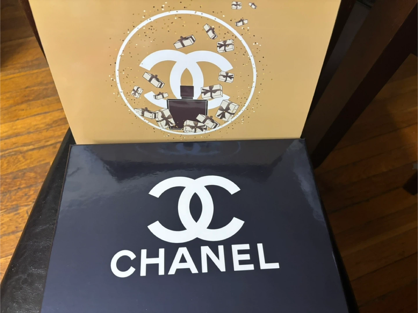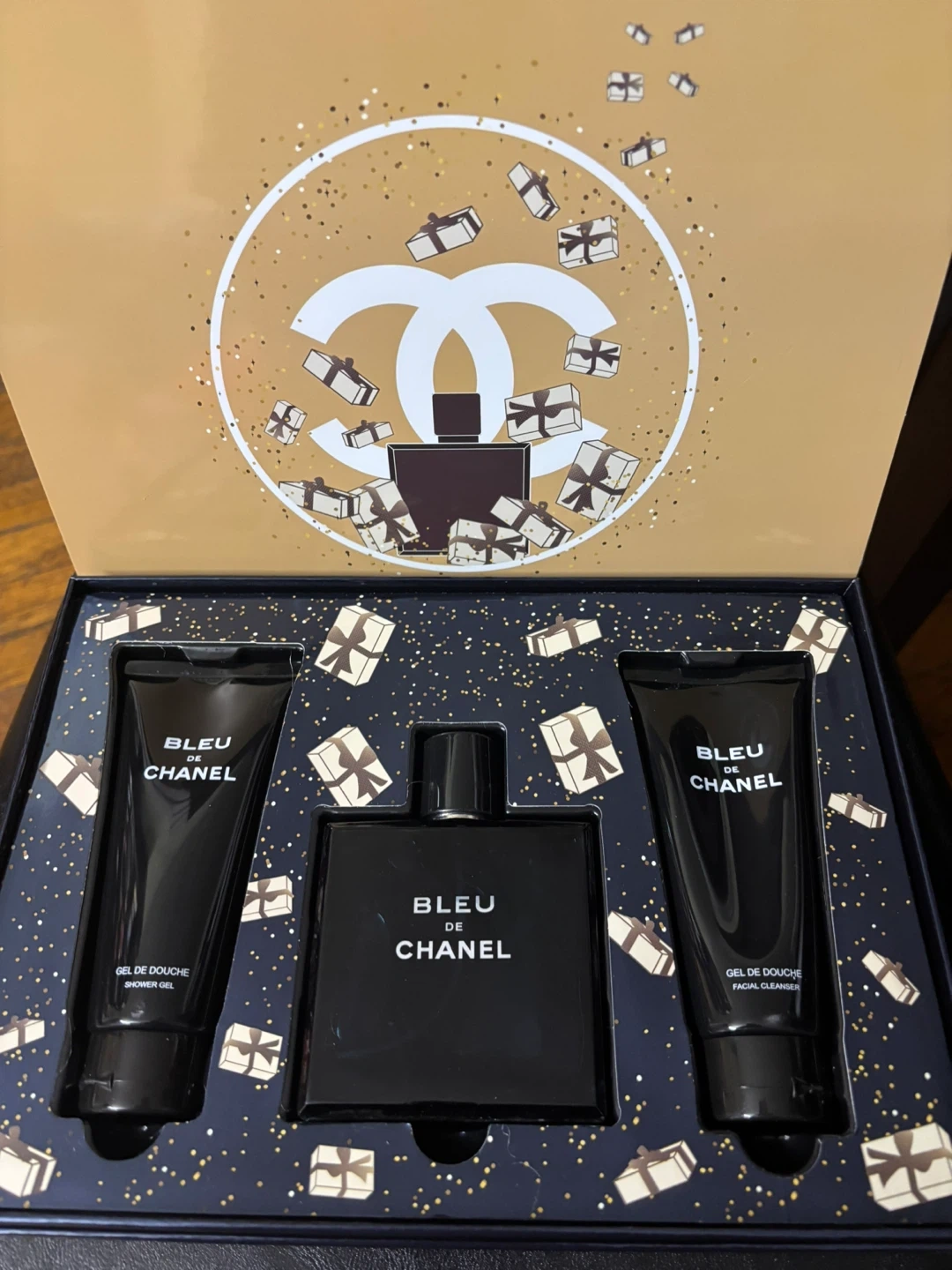 Selling a Bleu de Chanel gift set. It includes Eau de Parfum 3.4 FL OZ, Facial Cleanser 3.4 FL OZ, and Bubbly Shower Gel 3.4 FL OZ. The box is included