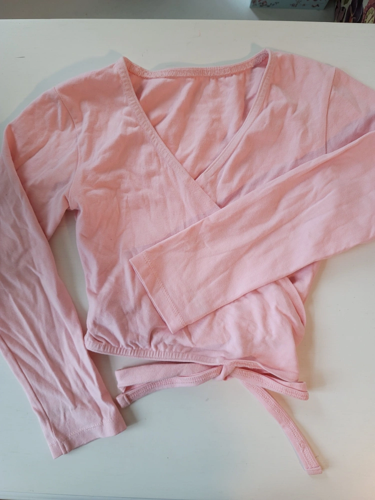 A lovely wrap top. Features long sleeves. The top is in a light pink color. It would be the perfect garment for gentle stretches or a slow morning.