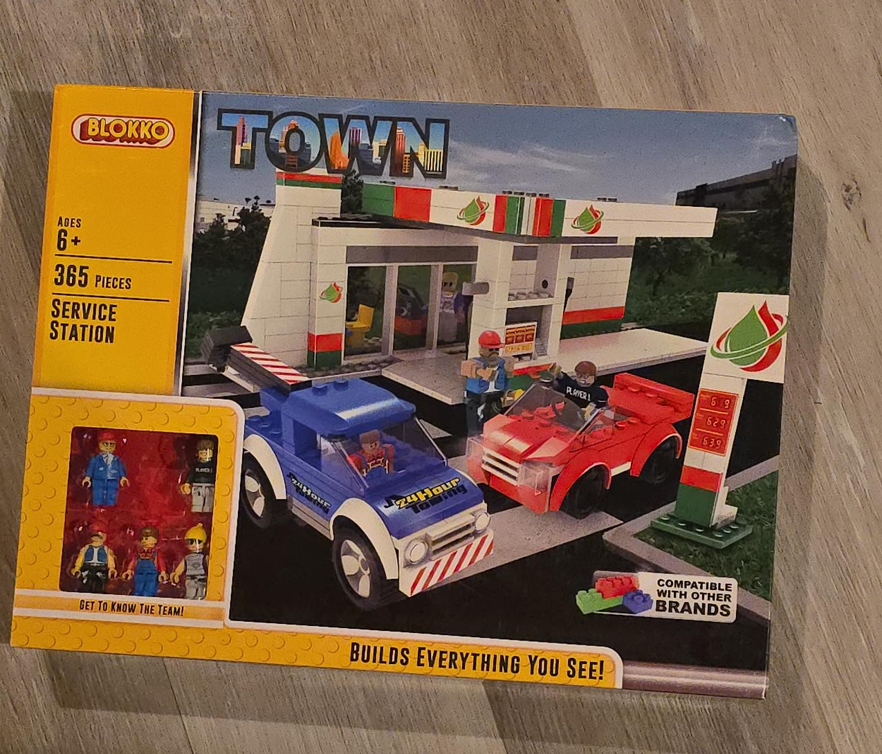 Selling a Blokko Town Service Station set! It includes 365 pieces and is suitable for ages 6+. The set allows you to build everything you see in the picture, including the service station and vehicles. It's also compatible with other brands!