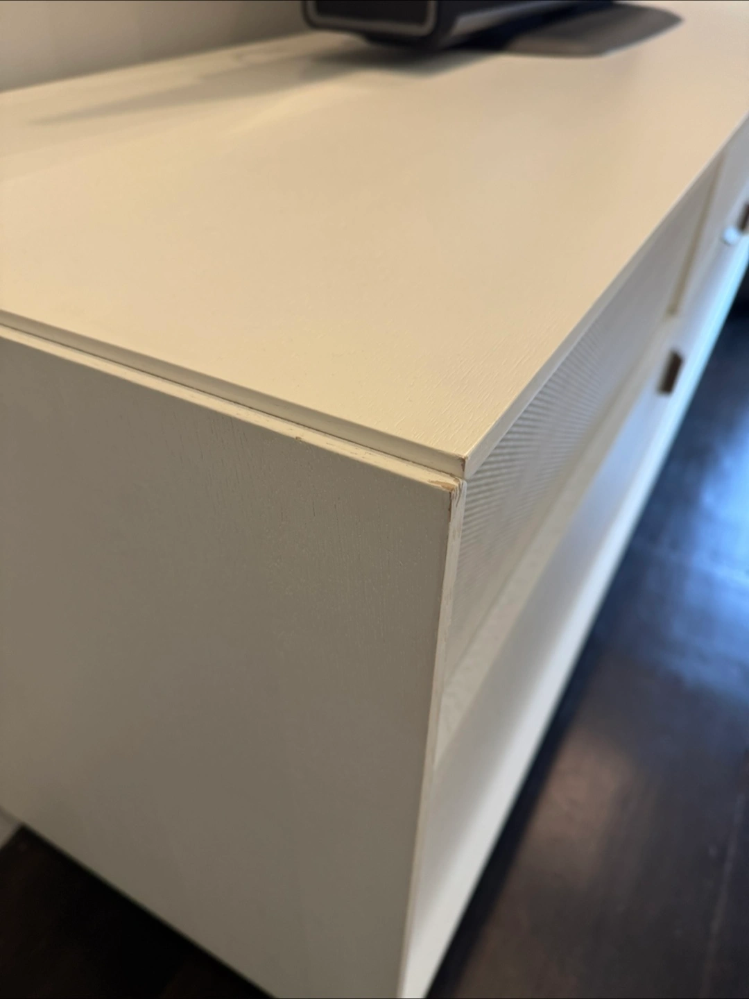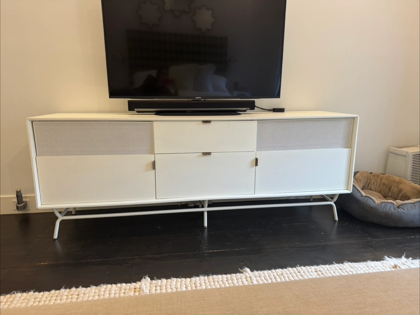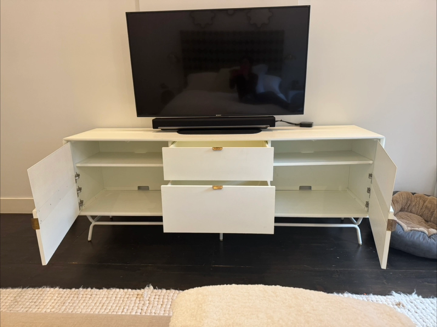 60Lovely white media console from Blu Dot. Featuring two drawers and open cabinet space. Metal legs and gold-colored hardware. Has a subtle woven texture across the front. You'll love using this to organize your living room space, it can create a calm atmosphere for your home.