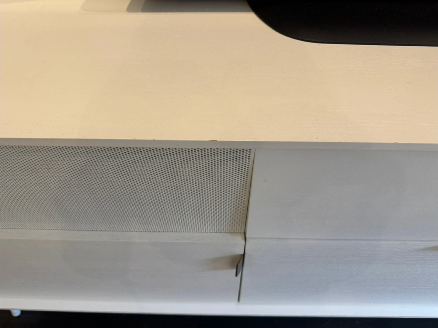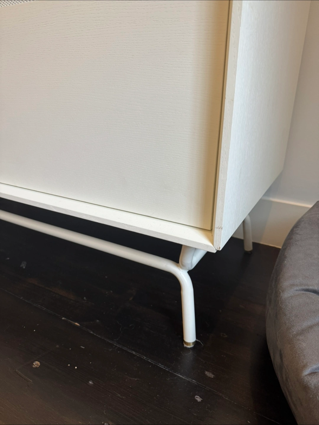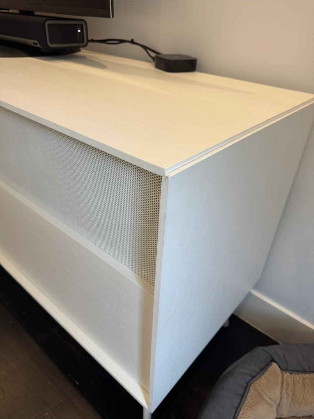 60Lovely white media console from Blu Dot. Featuring two drawers and open cabinet space. Metal legs and gold-colored hardware. Has a subtle woven texture across the front. You'll love using this to organize your living room space, it can create a calm atmosphere for your home.