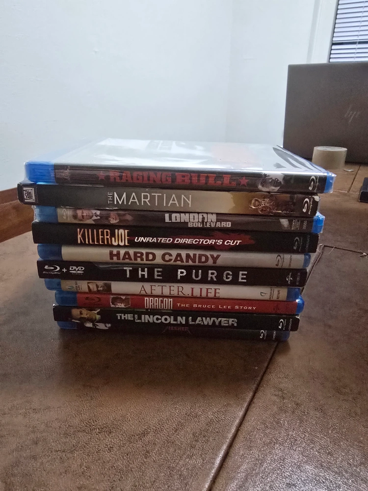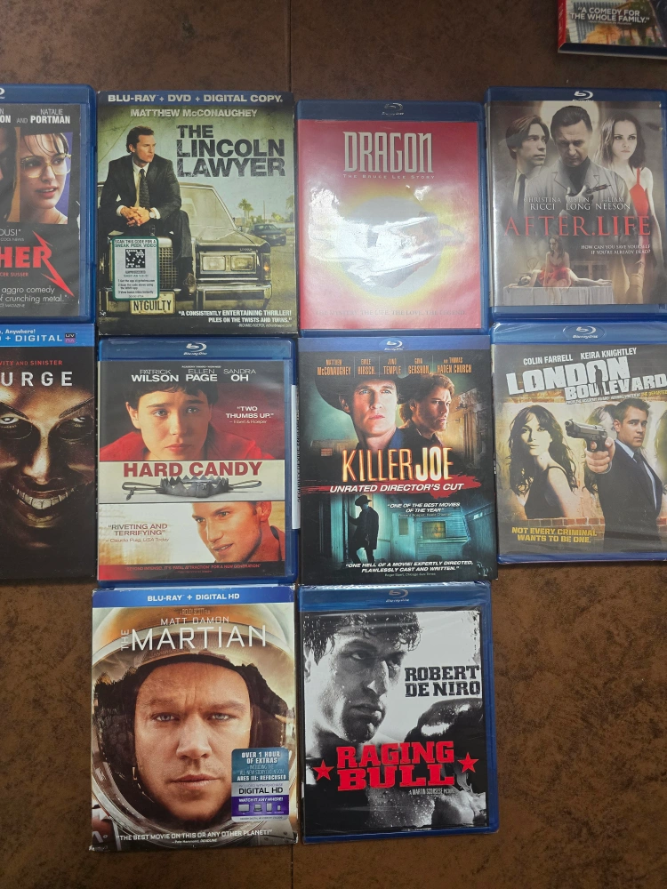 Selling a collection of Blu-ray movies, including titles like The Lincoln Lawyer, Dragon, After.Life, The Purge, Hard Candy, Killer Joe, London Boulevard(new), The Martian(new), and Raging Bull(new). Great for movie nights! Much larger collection willing to work with buyer on other movies and deals. Inquire by messaging.