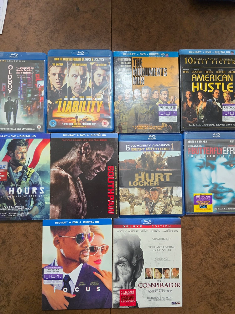 Selling a collection of Blu-ray movies. Titles include: - The Conspirator - Focus - The Butterfly Effect(new) - Hurt Locker - Southpaw - 13 Hours - American Hustle - The Monuments Men - The Liability - Oldboy Much larger collection willing to work with buyer on other movies and deals. Inquire by messaging.