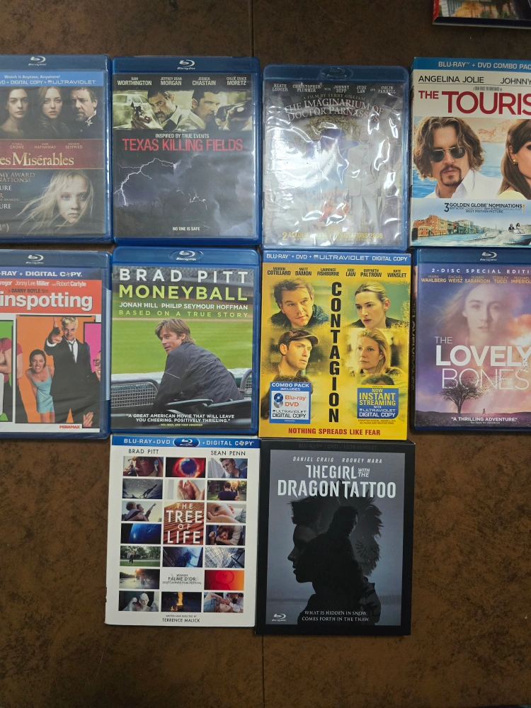 60Selling a collection of Blu-ray movies. Titles include Les Miserables(new), Texas Killing Fields, The Imaginarium of Doctor Parnassus(new), The Tourist, Trainspotting(new), Moneyball, Contagion, The Lovely Bones, The Tree of Life, and The Girl with the Dragon Tattoo Much larger collection willing to work with buyer on other movies and deals. Inquire by messaging.