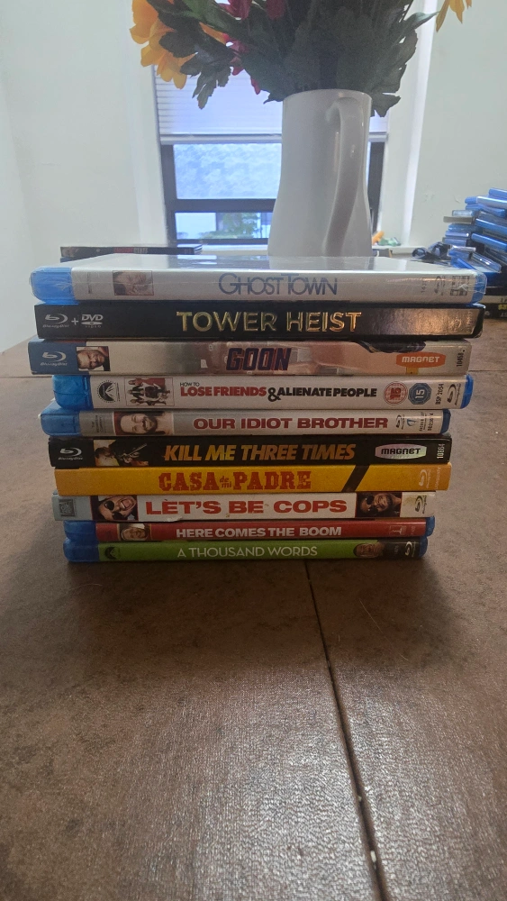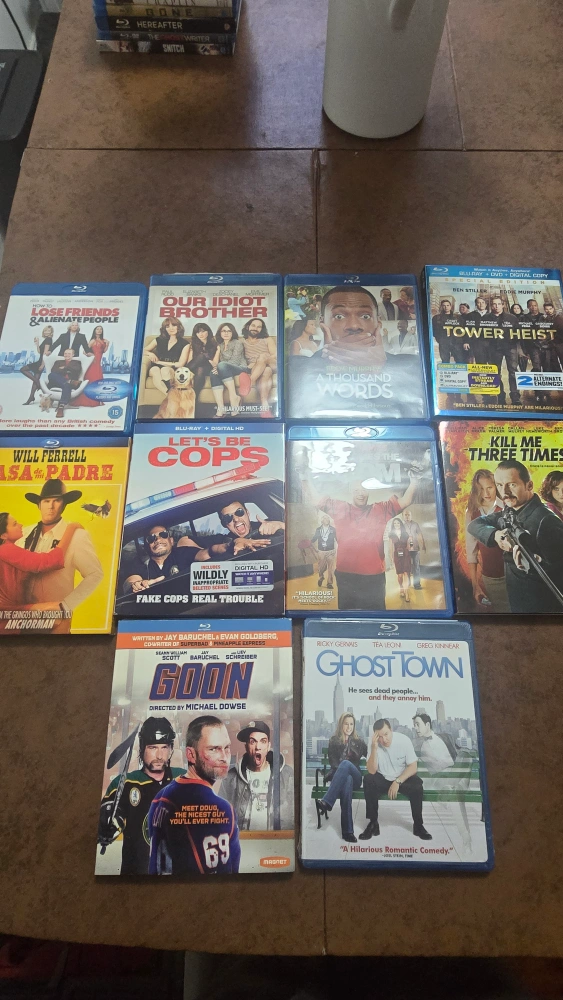 Selling a bundle of Blu-ray movies! Titles include: - Lose Friends & Alienate People - Our Idiot Brother - A Thousand Words - Tower Heist(sealed) - Casa de Mi Padre - Let's Be Cops - Here Comes the Boom - Kill Me Three Times - Goon(sealed) - Ghost Town(sealed)