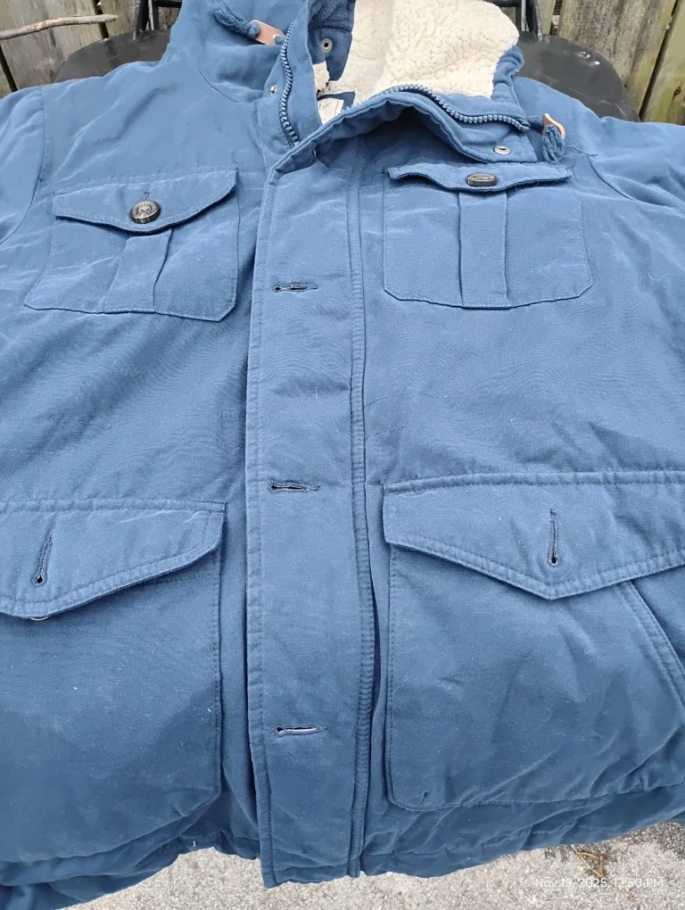 19Here's a blue Abercrombie & Fitch winter parka! It has a sherpa-lined hood and several pockets on the front. Perfect for staying warm this winter!
