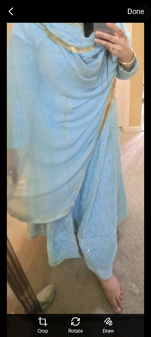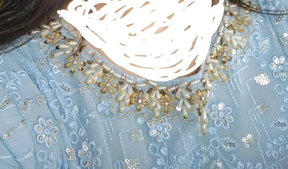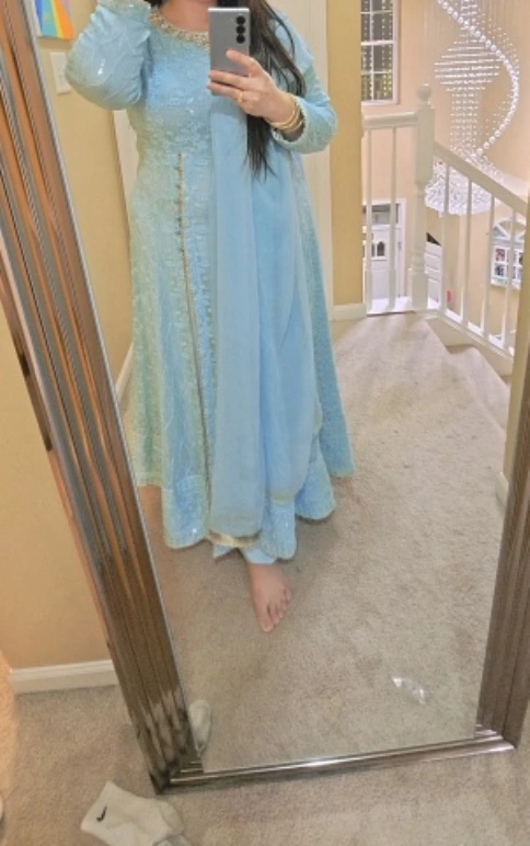 Selling a beautiful light blue Anarkali dress. It features intricate detailing around the neckline and a lovely flowing design. Perfect for special occasions!