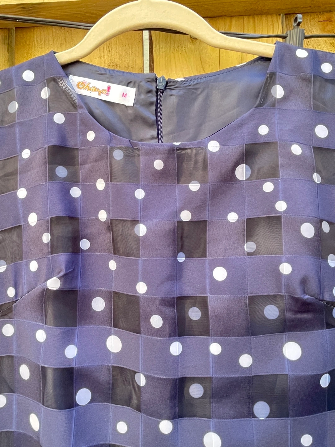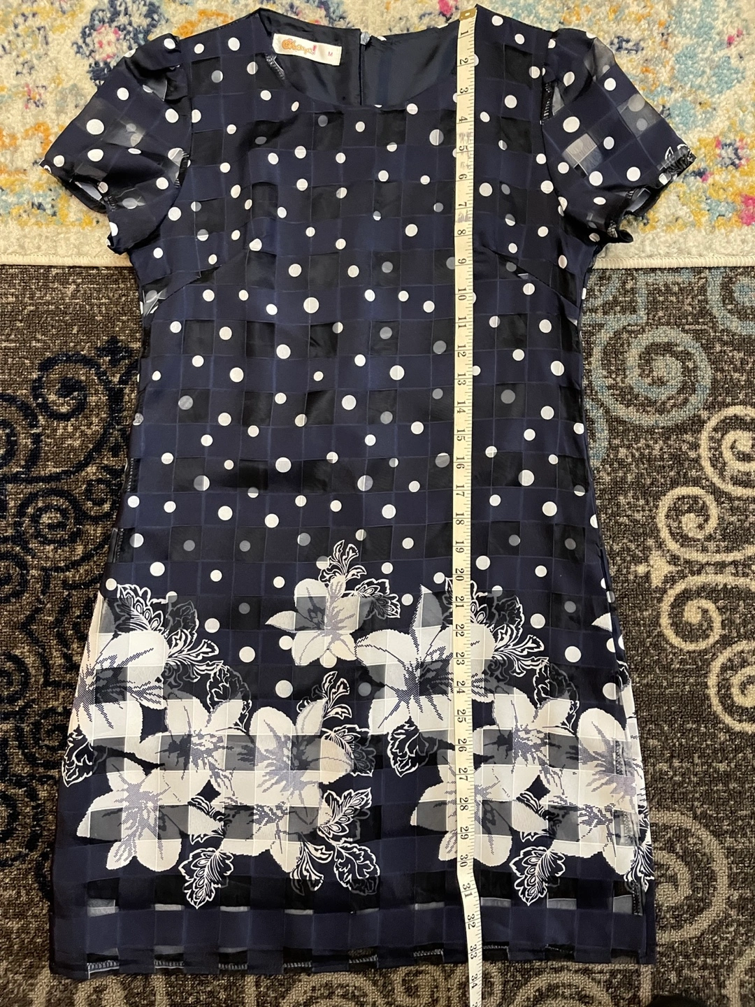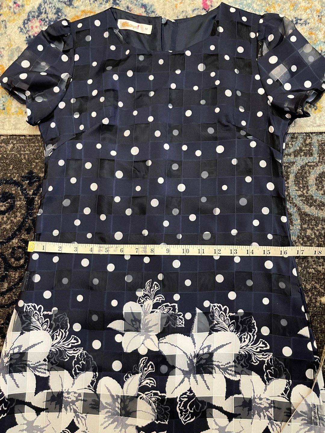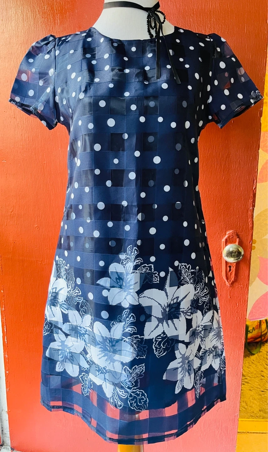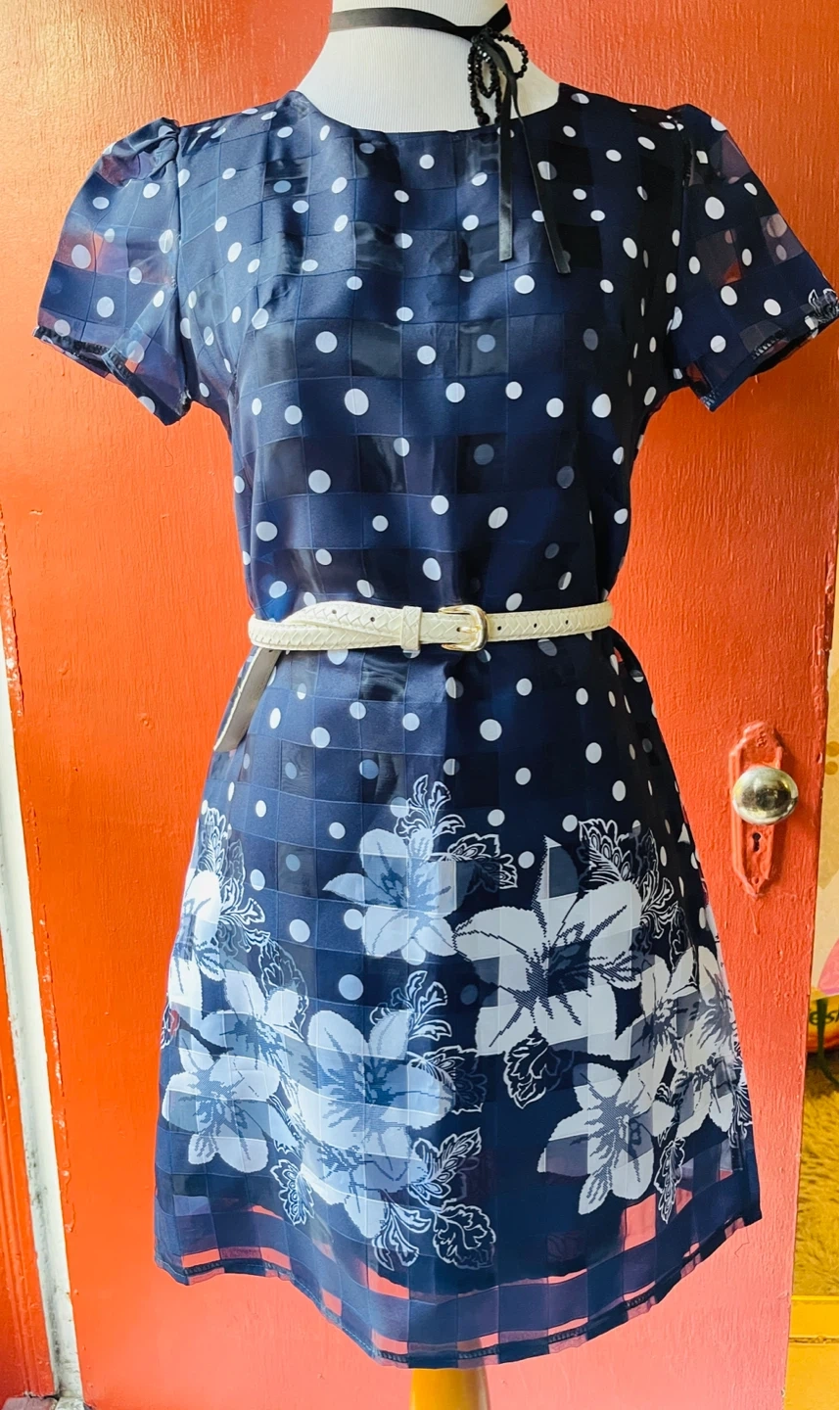 Blue and white polka dot and floral dress with a checkered pattern. Short sleeves and a zipper in the back. Size M.