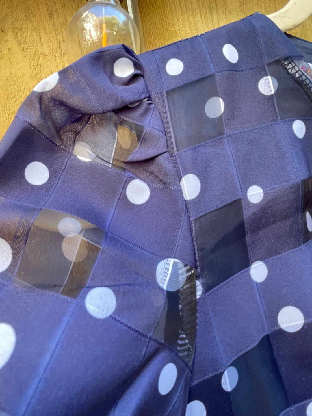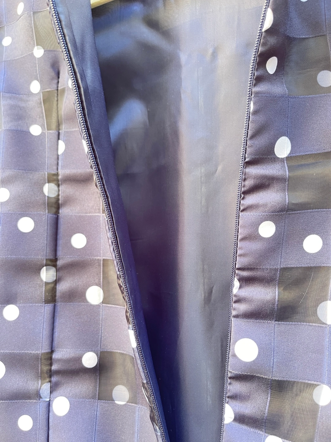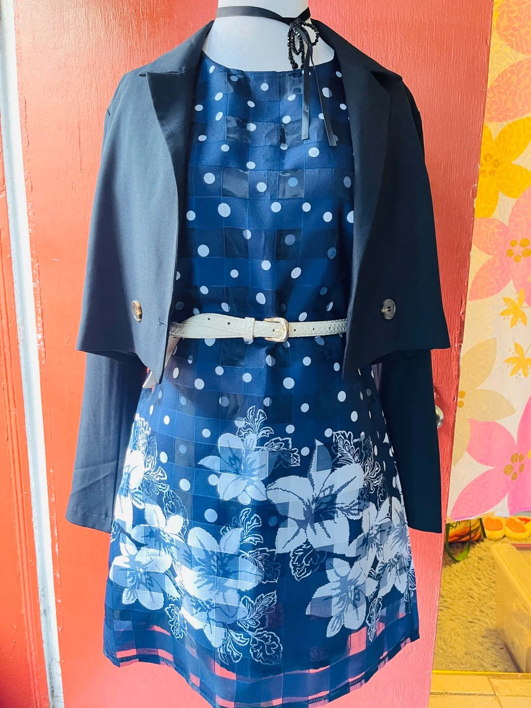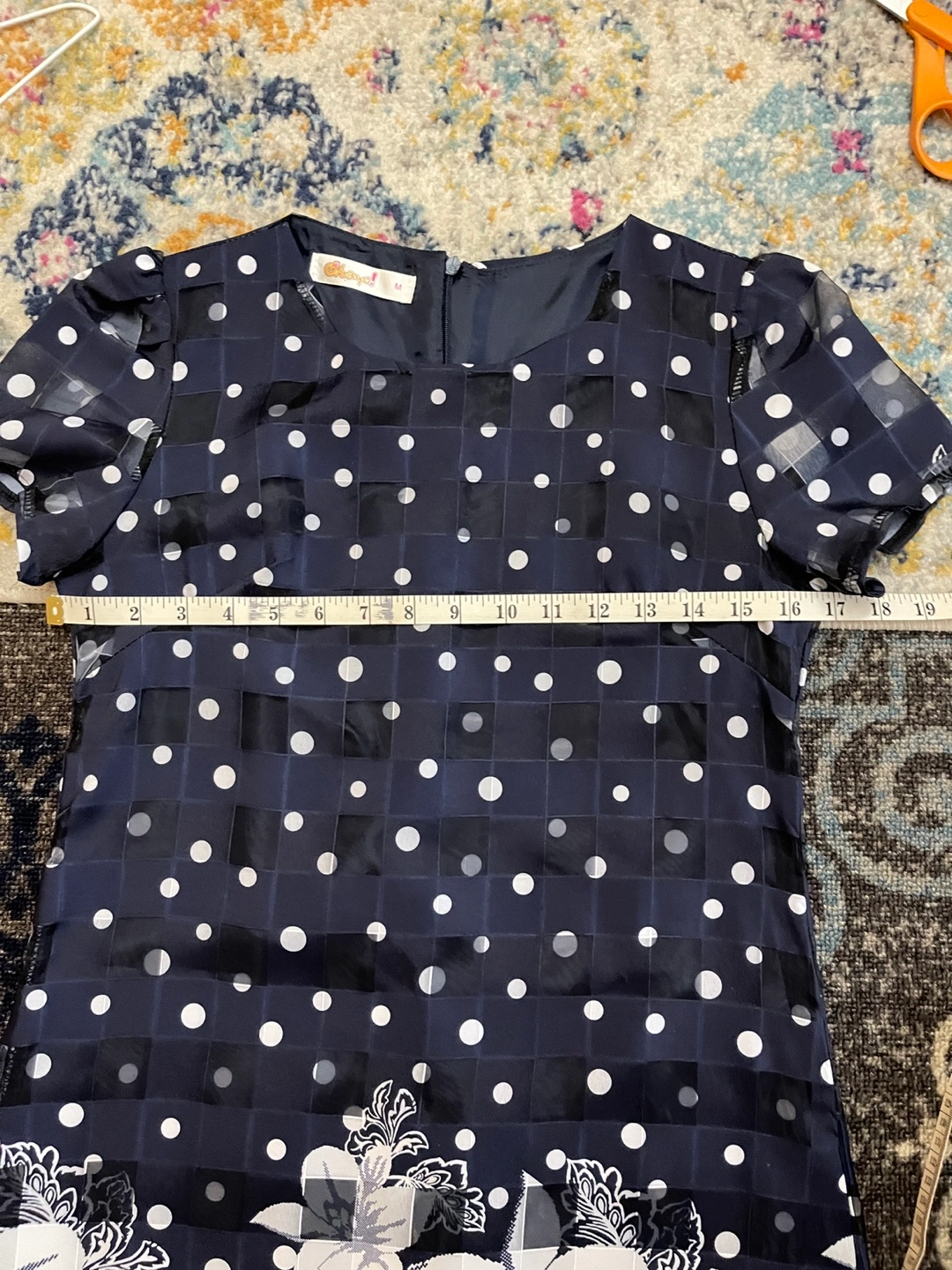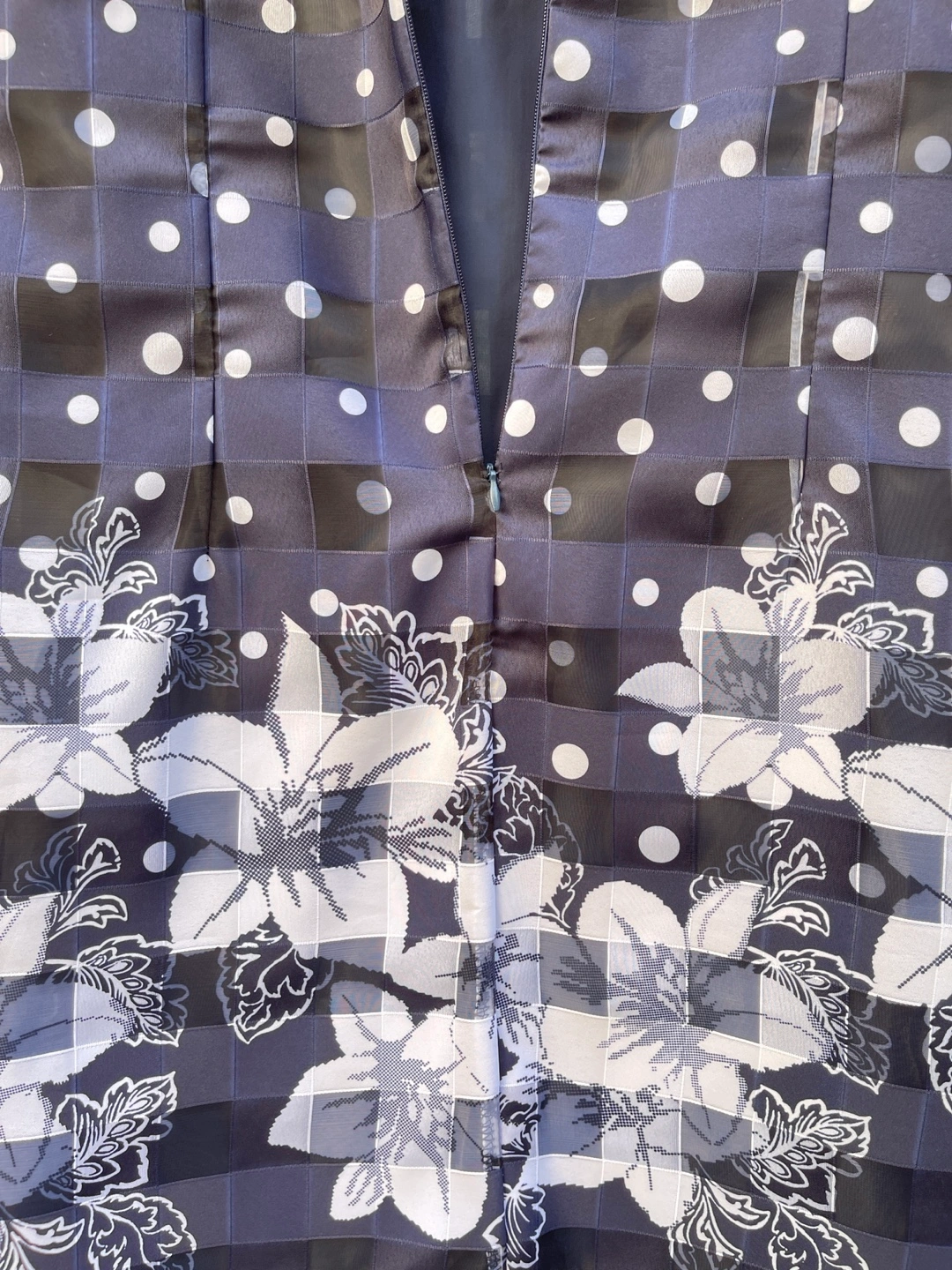 Blue and white polka dot and floral dress with a checkered pattern. Short sleeves and a zipper in the back. Size M.
