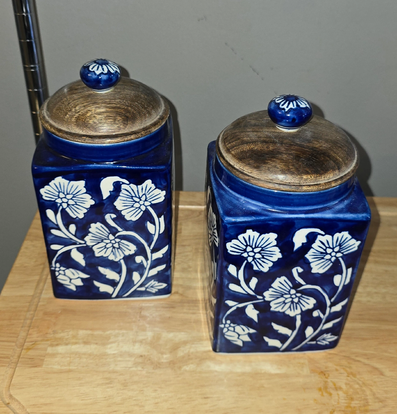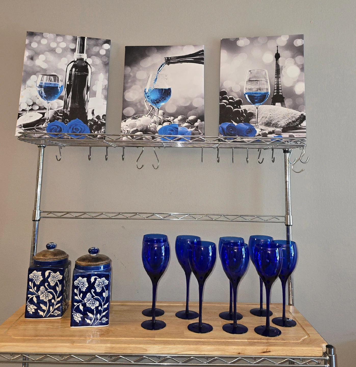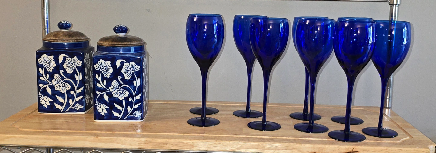 Selling a set of blue decorative canisters with floral designs and wine glasses. Also 3 pc. canvas wall art. Sold individually or as a set. $10 wall art, $10 wine glass set of 9, $10 canister set. All pieces $25