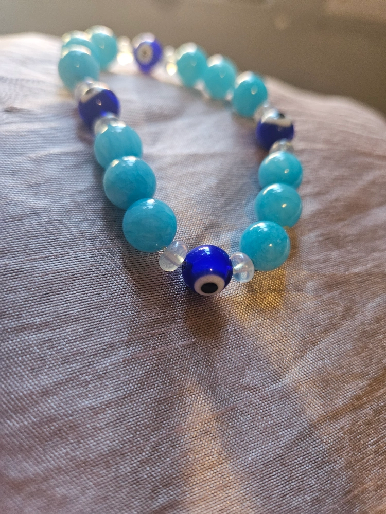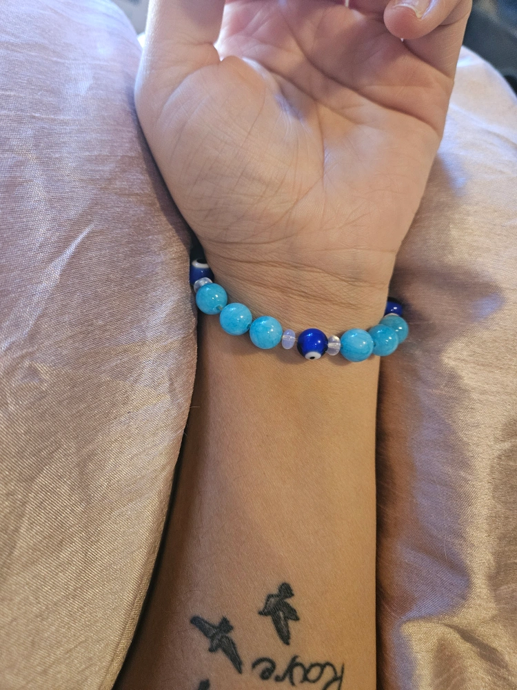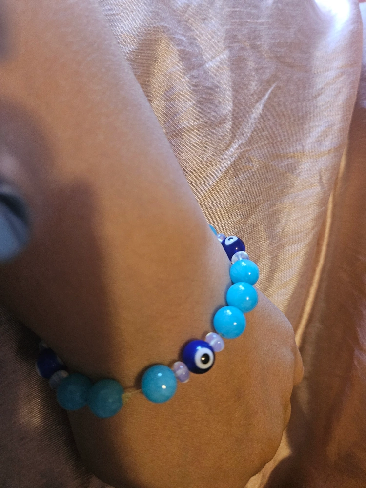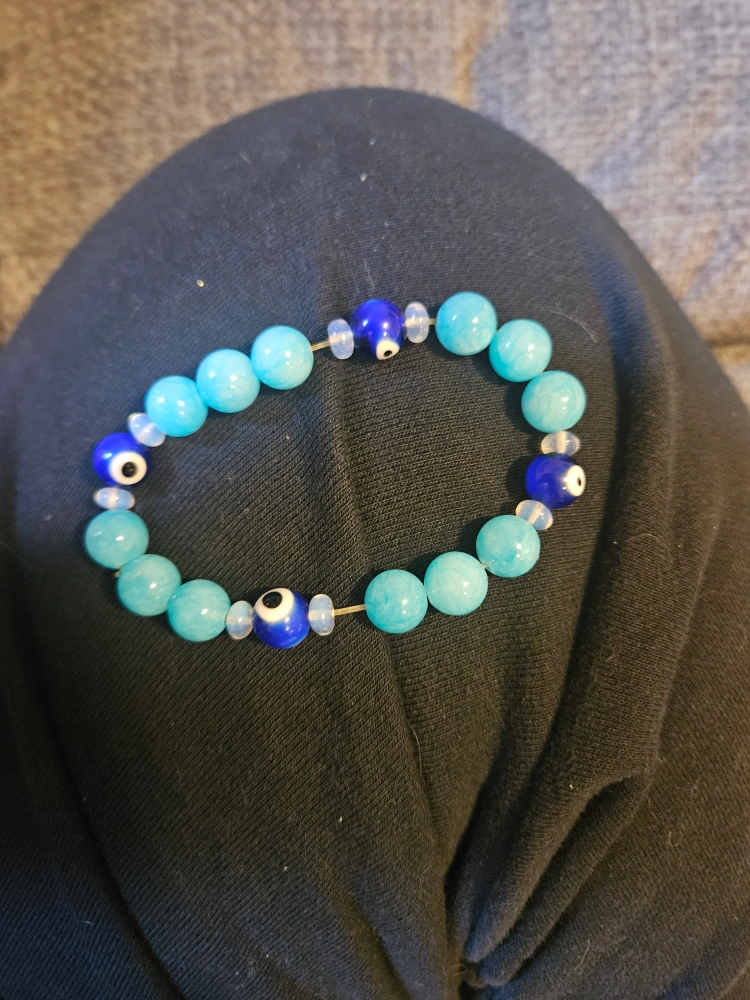 5Here's a cute beaded bracelet with a mix of light blue and dark blue evil eye beads! It's perfect for adding a pop of color to your outfit and warding off any bad vibes