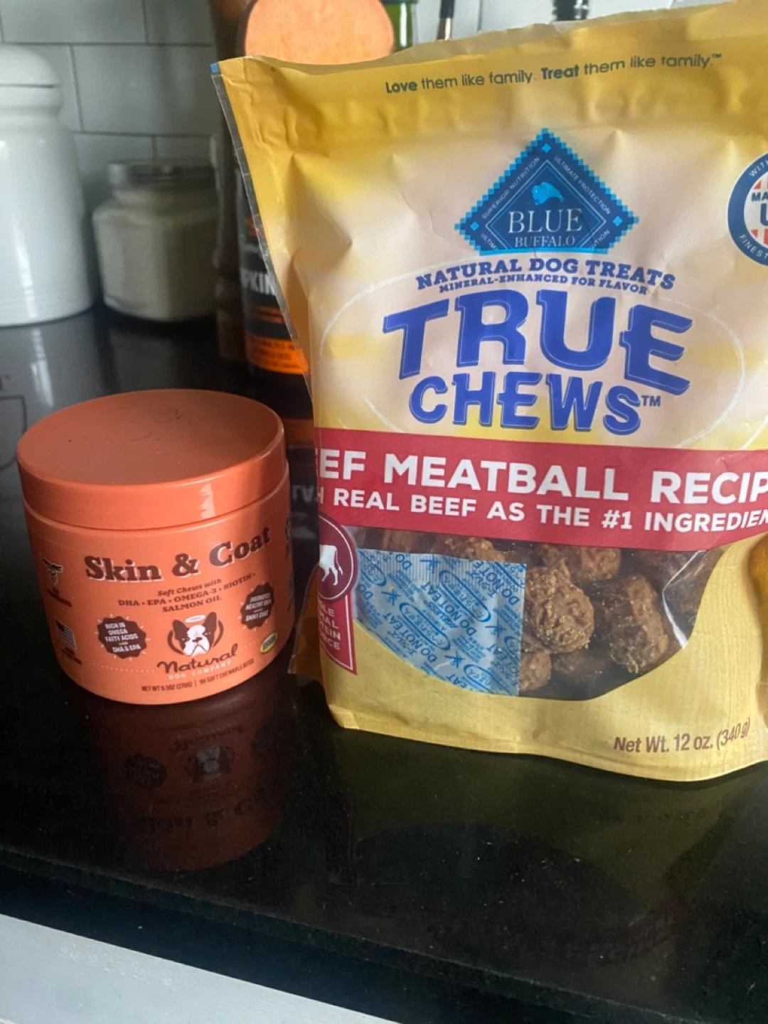 325I'm selling Blue Buffalo True Chews Natural Dog Treats and Skin & Coat Soft Chews for dogs! The True Chews are mineral-enhanced for flavor, with real beef as the #1 ingredient. The Skin & Coat chews contain DHA, EPA, Omega-3, and Biotin with salmon oil to promote a healthy skin and coat for your furry friend! Pup didn ’t like em, so getting rid of it