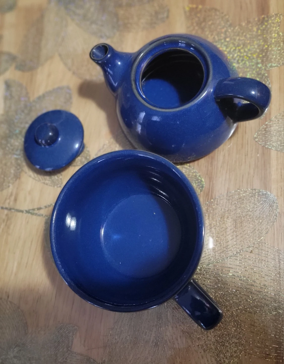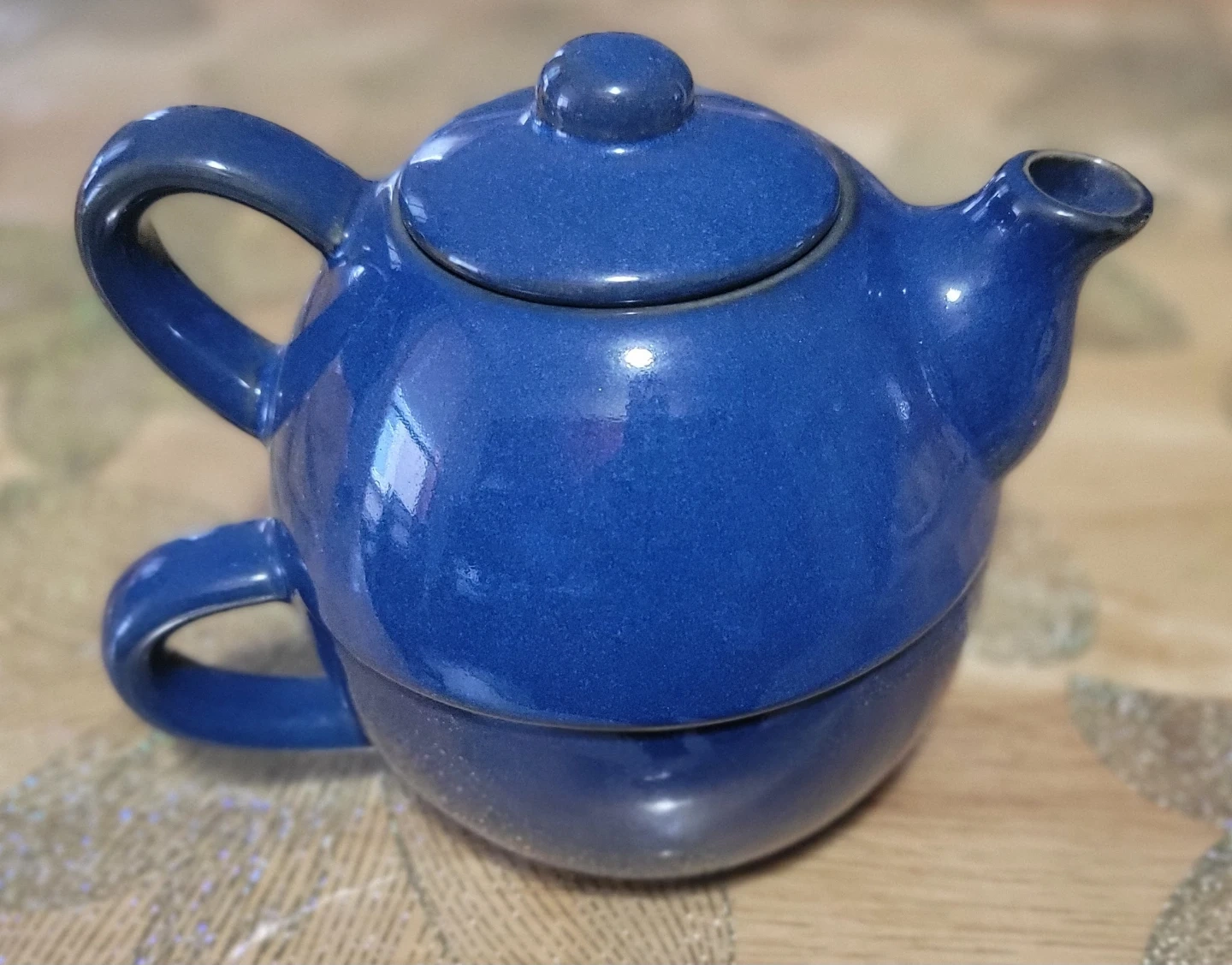 92I'm selling a cute blue ceramic teapot with a cup that stacks underneath it. The cup is about 4,5 inches in diameter and the whole set is around 5.5 inches tall. It's perfect for a single serving of tea!