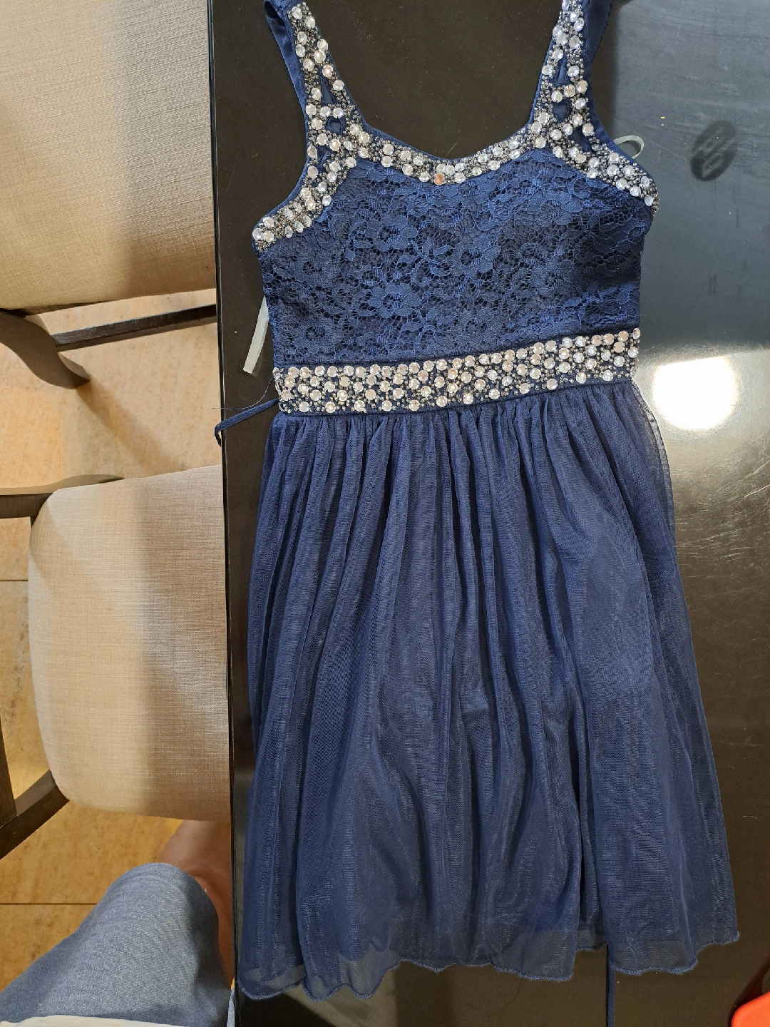This is a beautiful blue dress with lace and rhinestone embellishments. It's perfect for a special occasion or a night out. The dress is in great condition and ready for a new home
