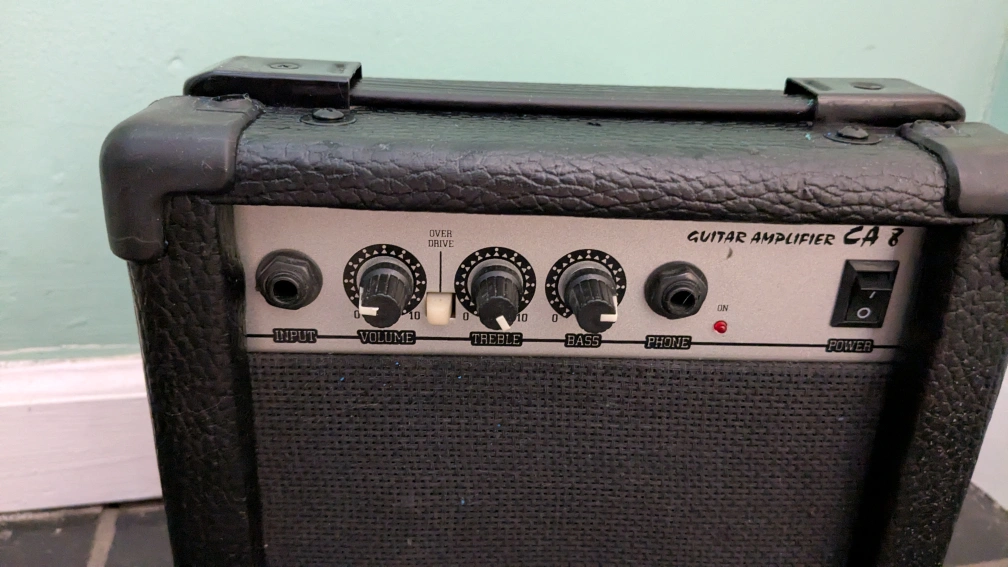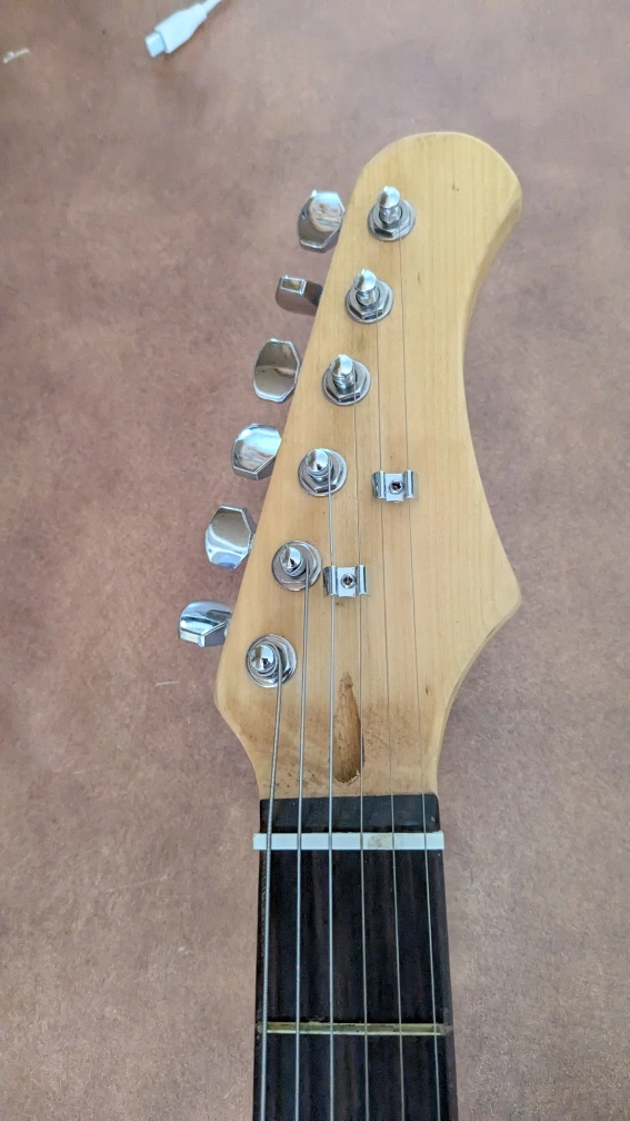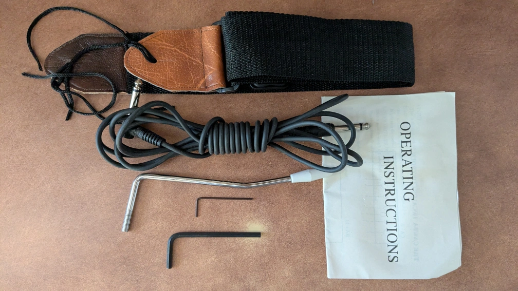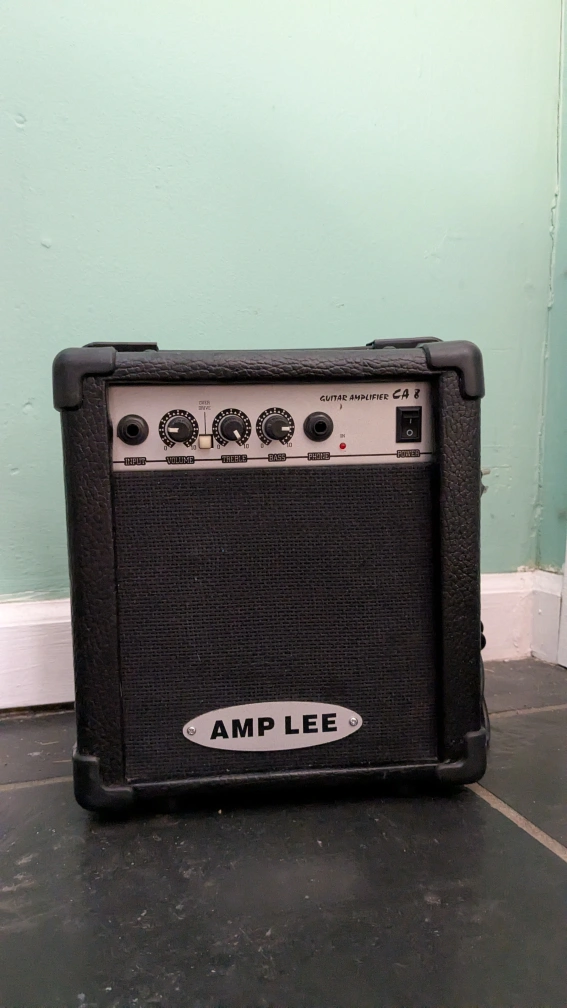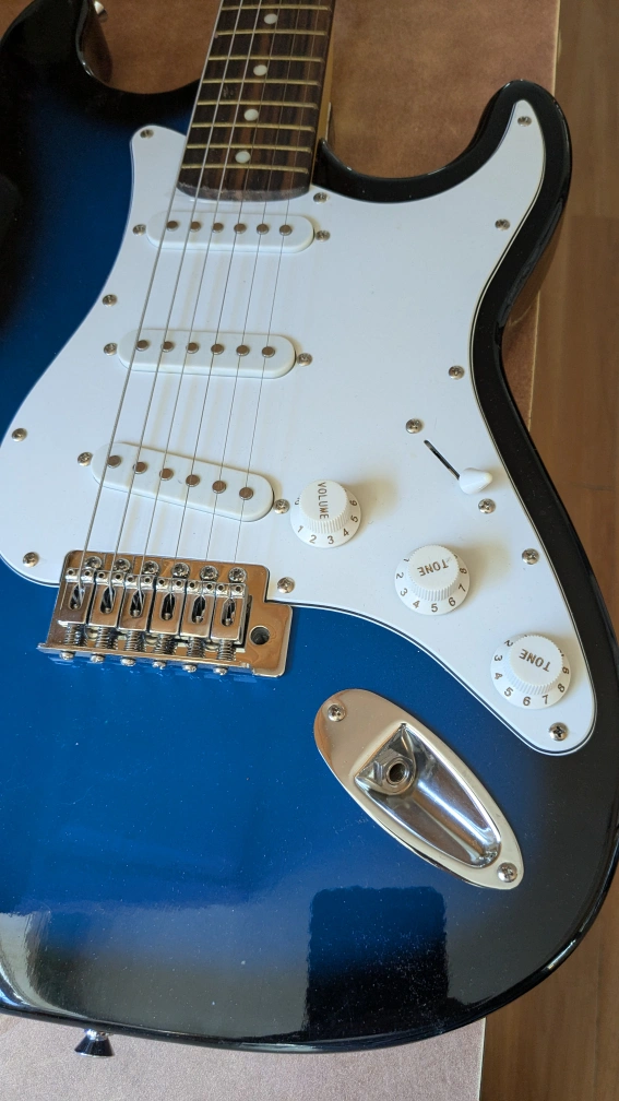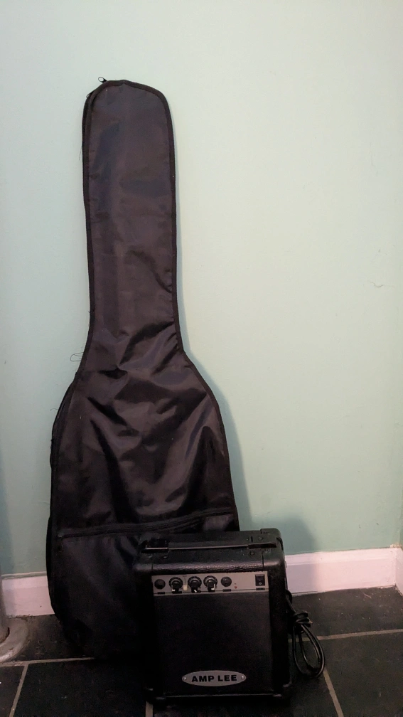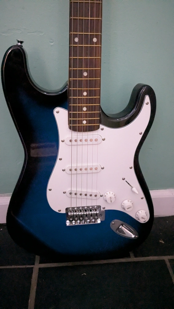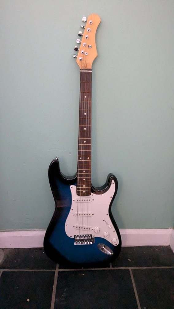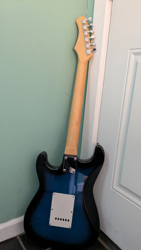 Electric guitar,full size, blue finish, rosewood fretboard. includes hardware. Waterproof Guitar bag with shoulder strap. Includes mini amplifier with electric plug and has port for headphones.. Good for beginners.