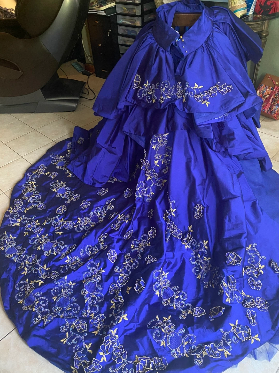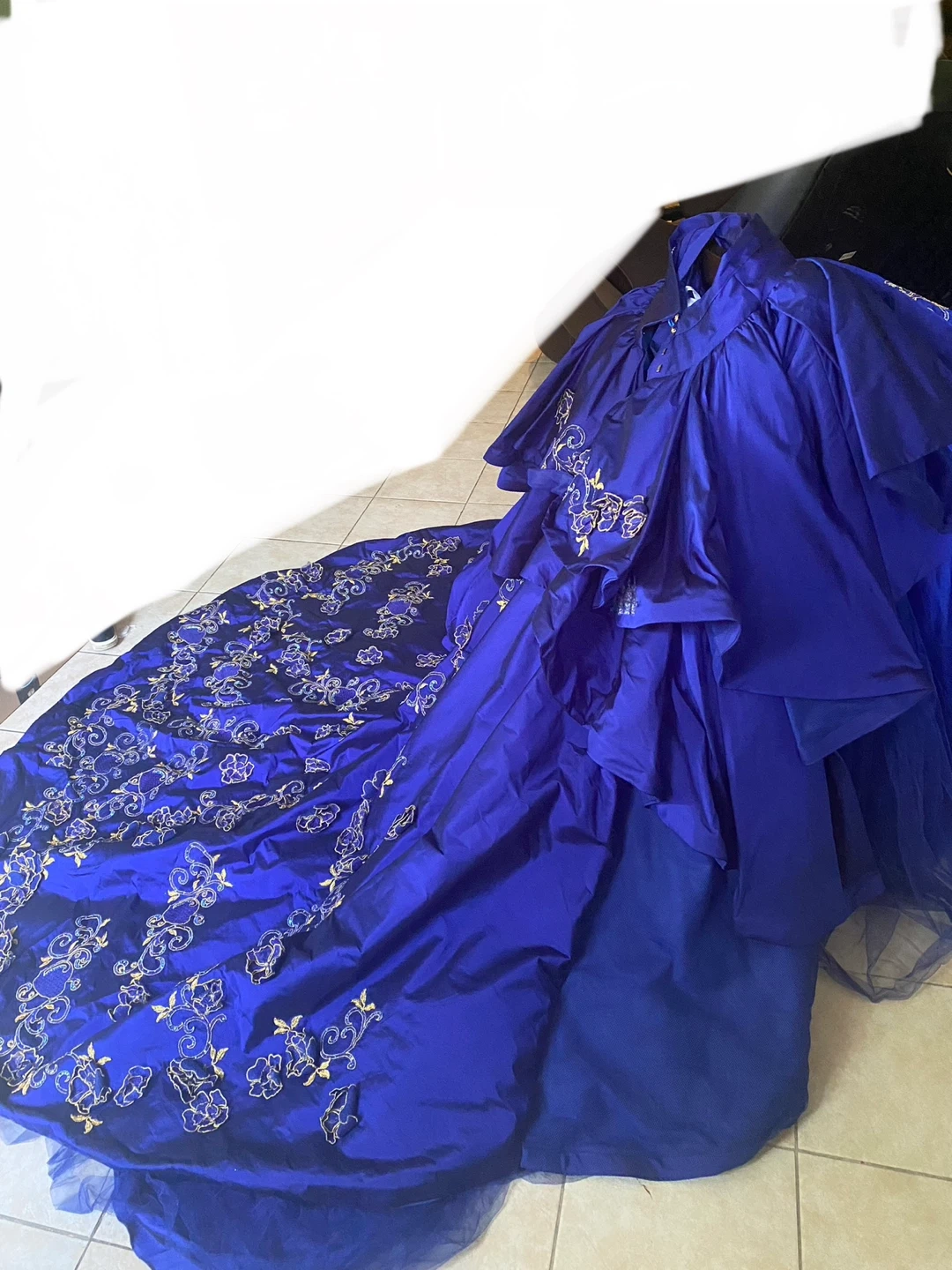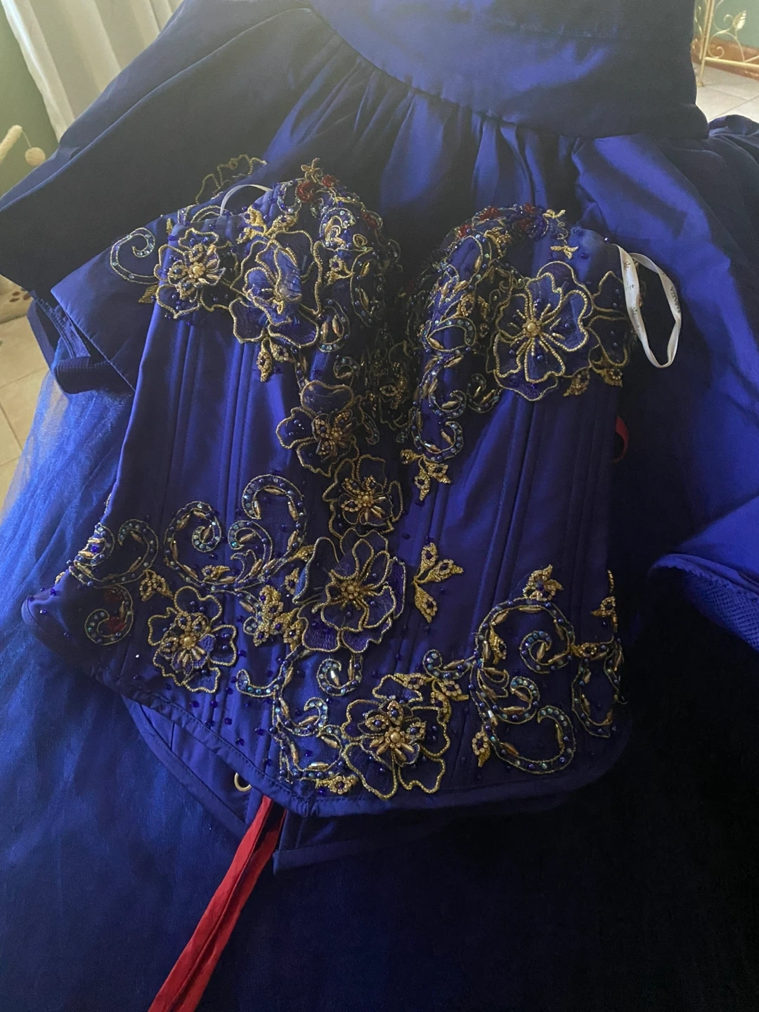 60Selling a beautiful blue dress with gold embroidery. It features a tiered skirt and a matching embroidered corset top. Perfect for a special occasion!