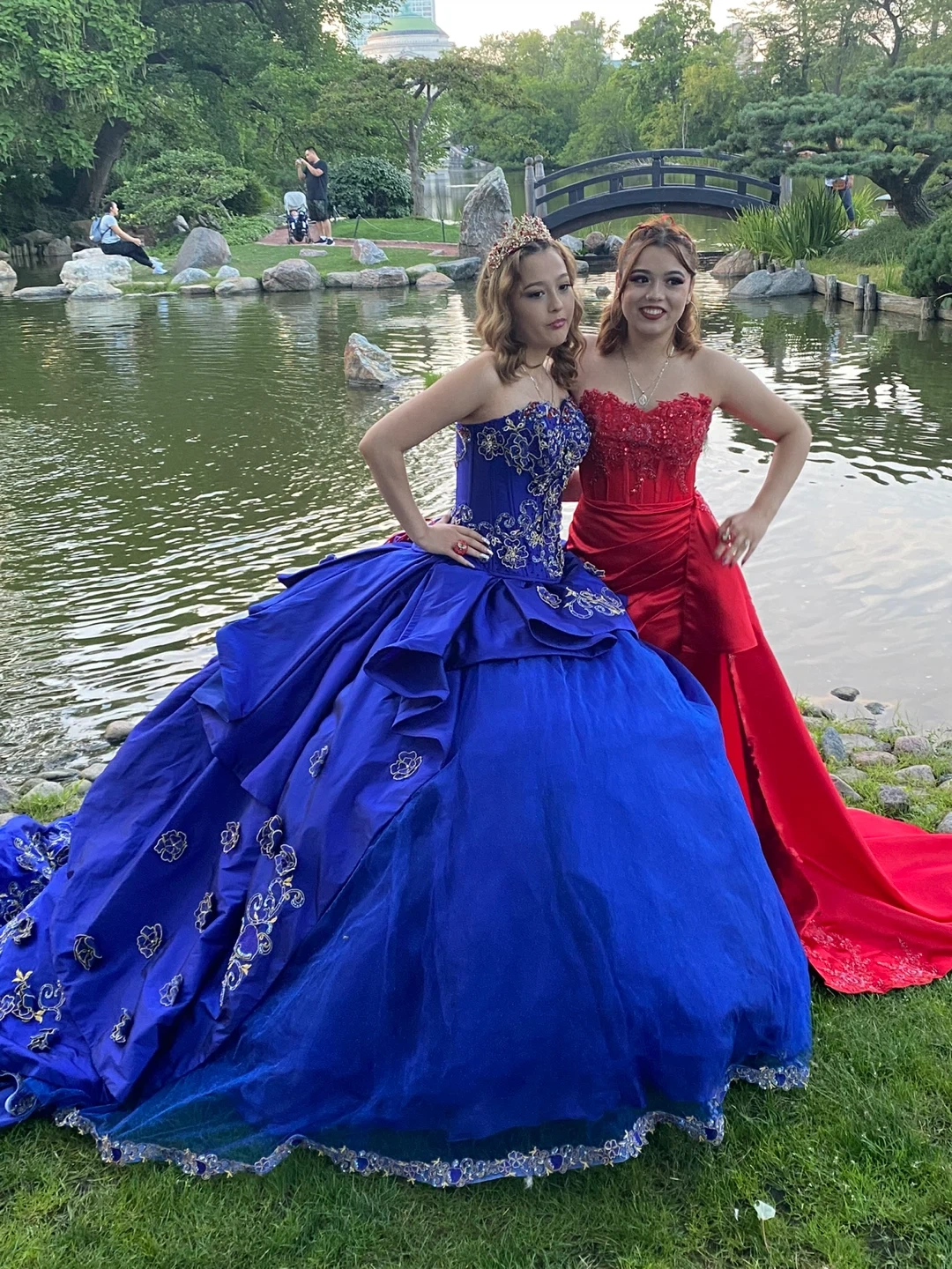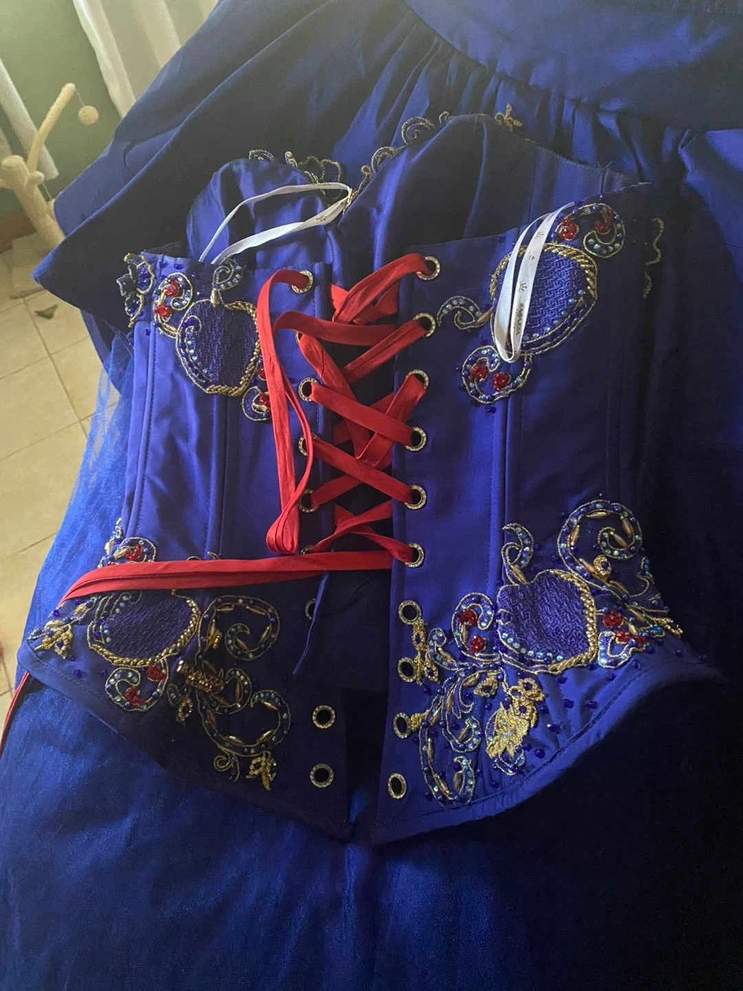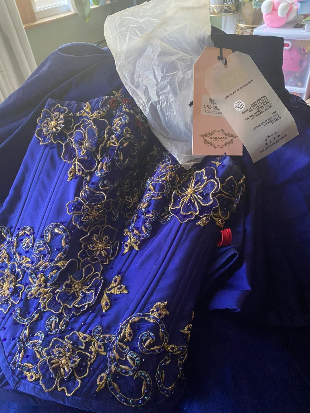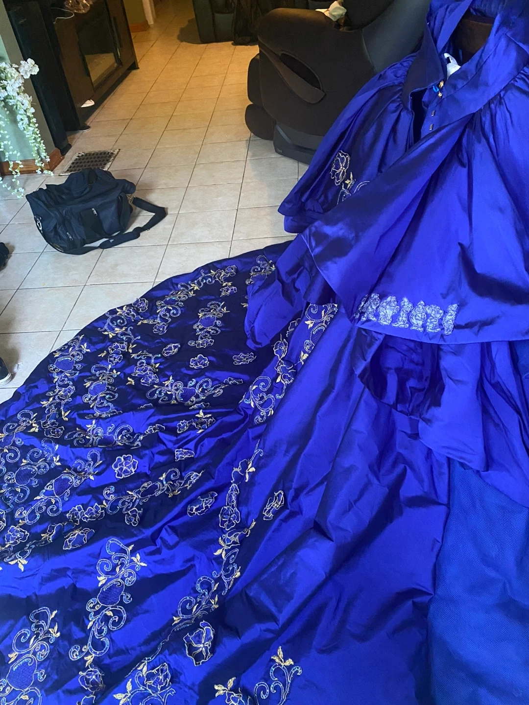 60Selling a beautiful blue dress with gold embroidery. It features a tiered skirt and a matching embroidered corset top. Perfect for a special occasion!