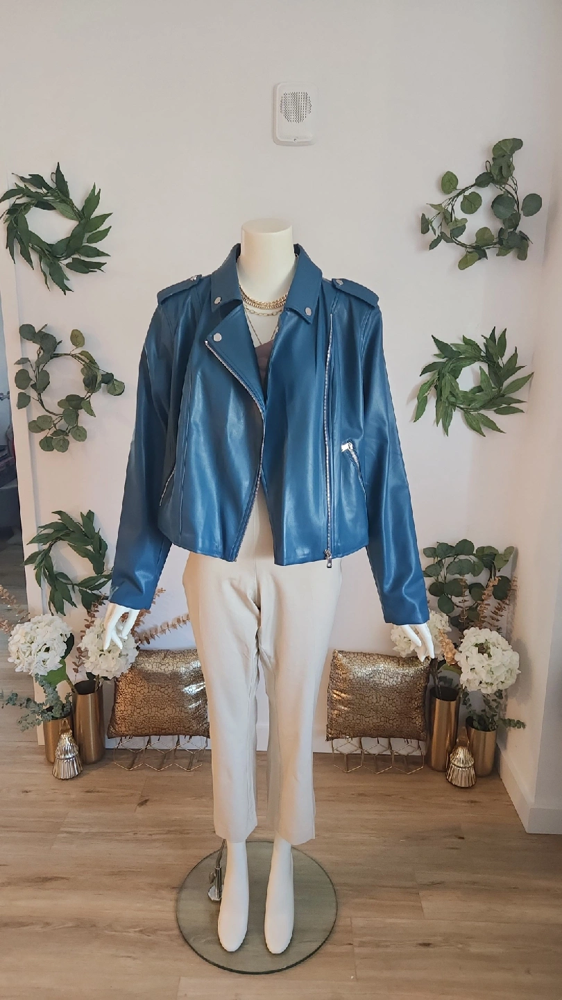 65Stylish blue faux leather moto jacket. Perfect for adding an edgy touch to any outfit!