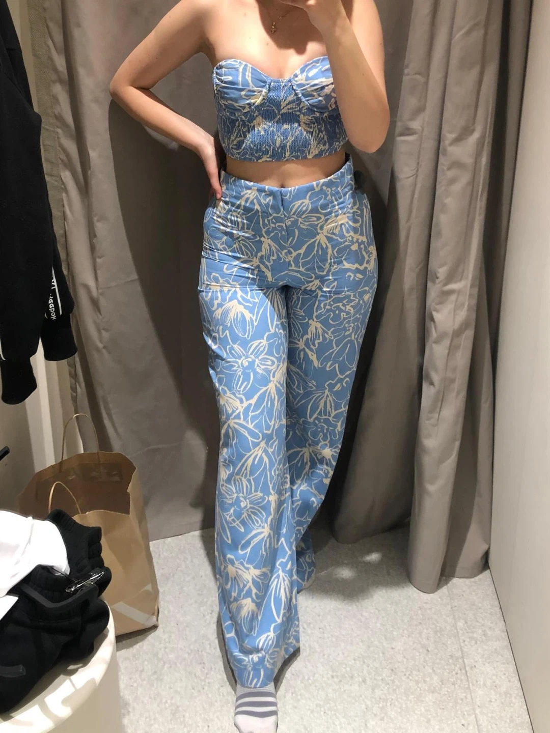20Cute matching set featuring a blue floral print. The set includes a strapless top and high-waisted pants. Perfect for a summery look!