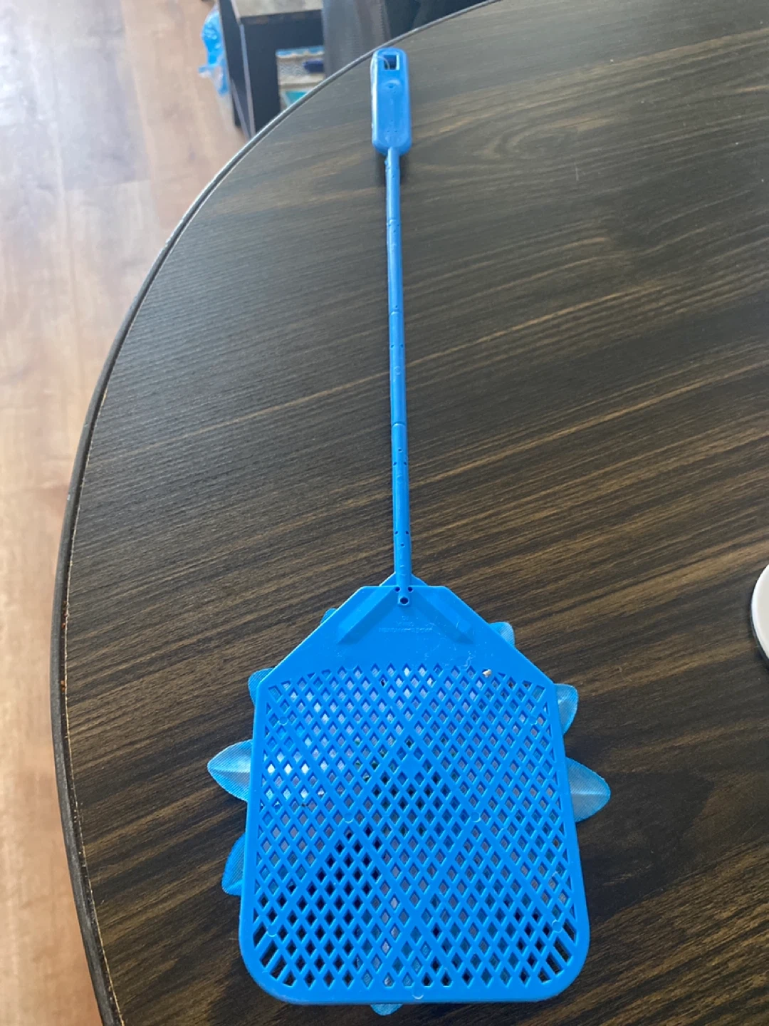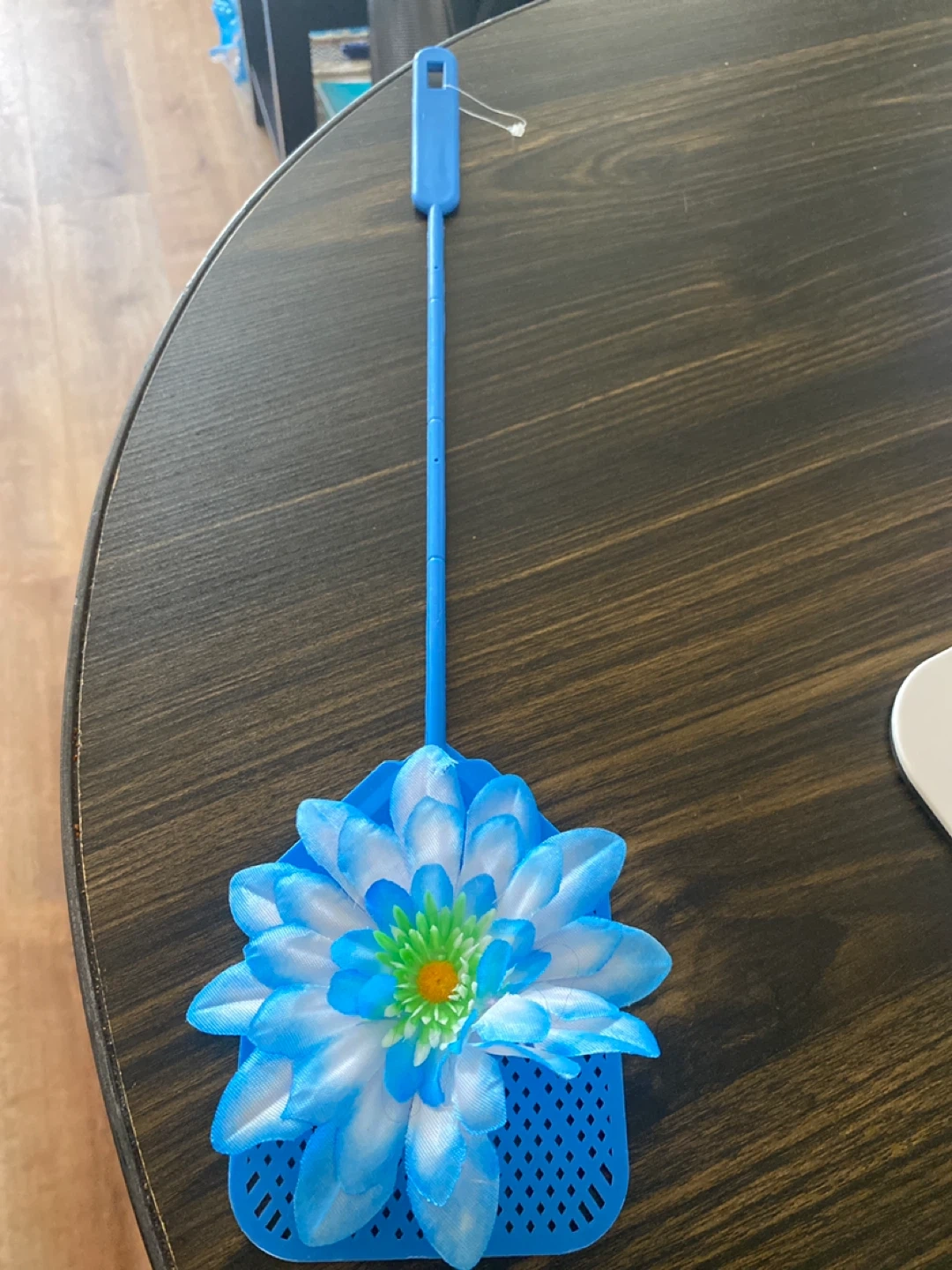 Here's a fun and functional blue fly swatter! It has a cute flower accent that makes it a bit more cheerful than your average fly swatter