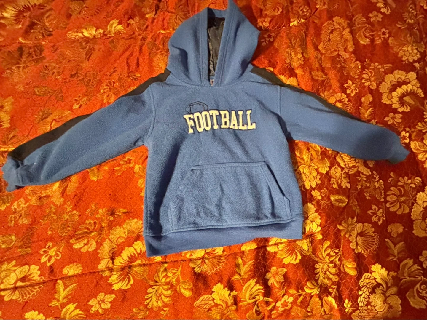 71Here is a blue hoodie with the word 'FOOTBALL' written on the front. It has a hood and a front pocket. It is in good condition.