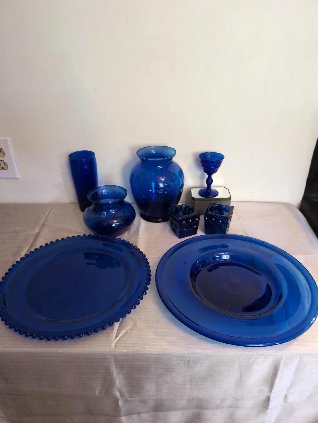 Selling a beautiful collection of blue glass items! Includes two different sized vases, two plates, two small square vases, and a small wine glass. Perfect for adding a pop of color to your home decor