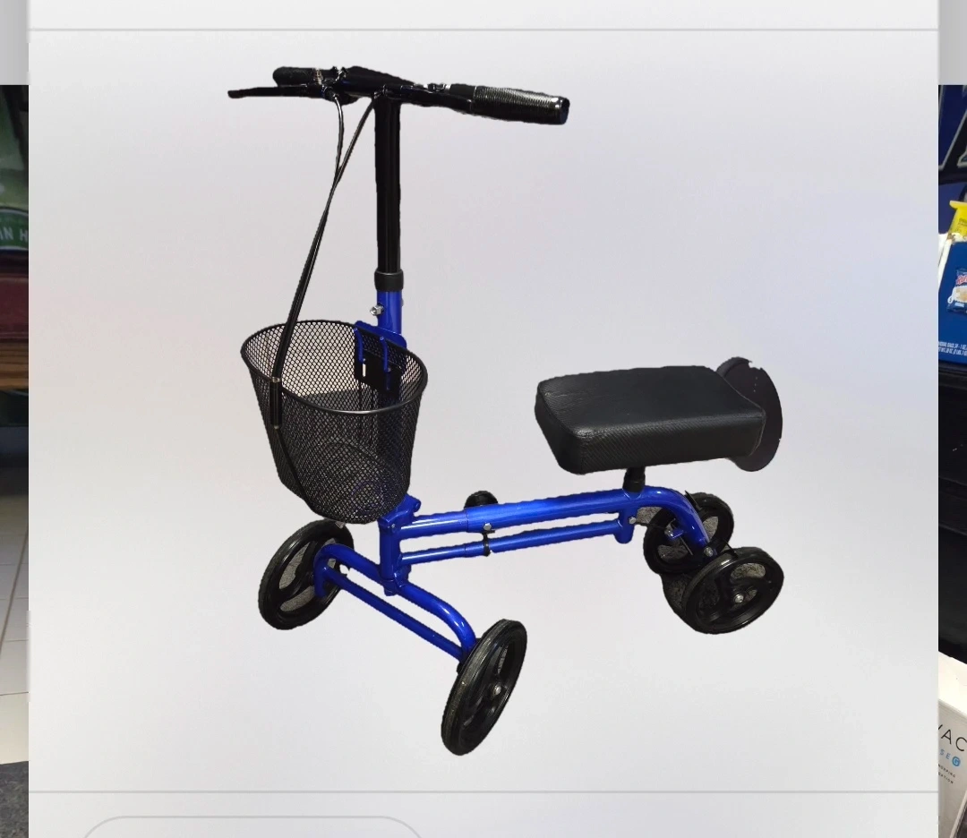 10Here's a blue knee walker scooter! It has a comfortable seat and a handy basket in the front. Perfect for getting around while recovering