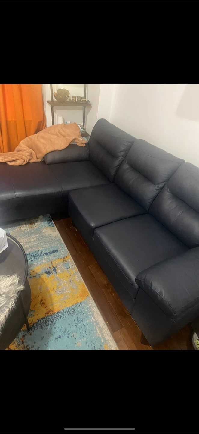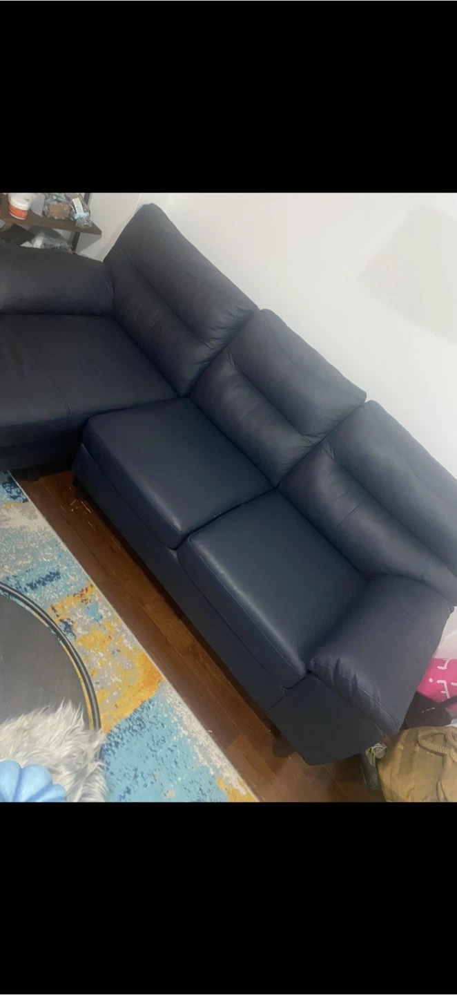 0Selling a blue leather sectional sofa. It's in great condition (barely used) and ready to find a new home! Perfect for a living room or entertainment area, this sofa offers a modern look
