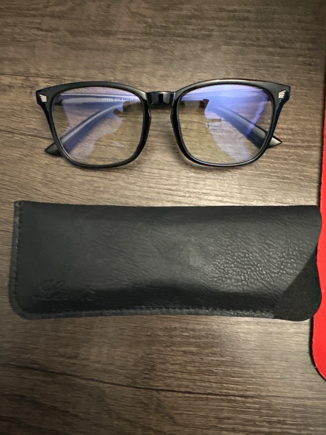 60Selling a pair of blue light reading glasses with a sleek black frame and a matching case! They're in great condition and perfect for anyone needing a little help with their reading vision and protection against blue light.