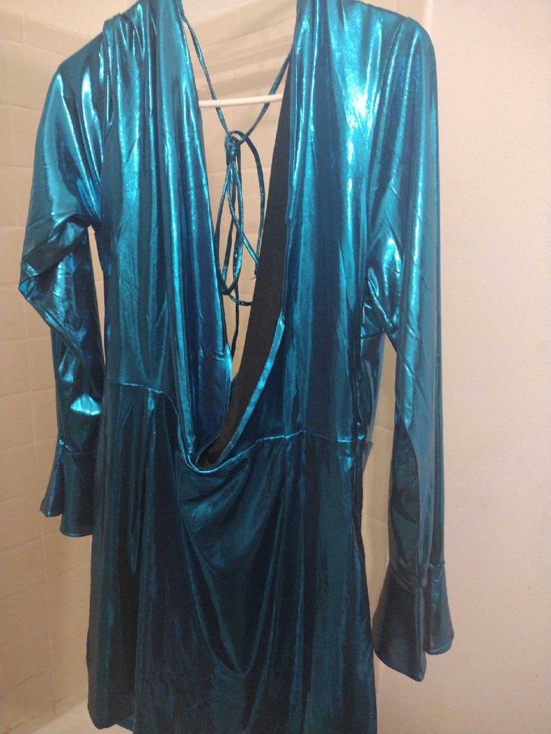 This is a shiny blue dress with long sleeves and a low back. It has a metallic look and a tie in the back.