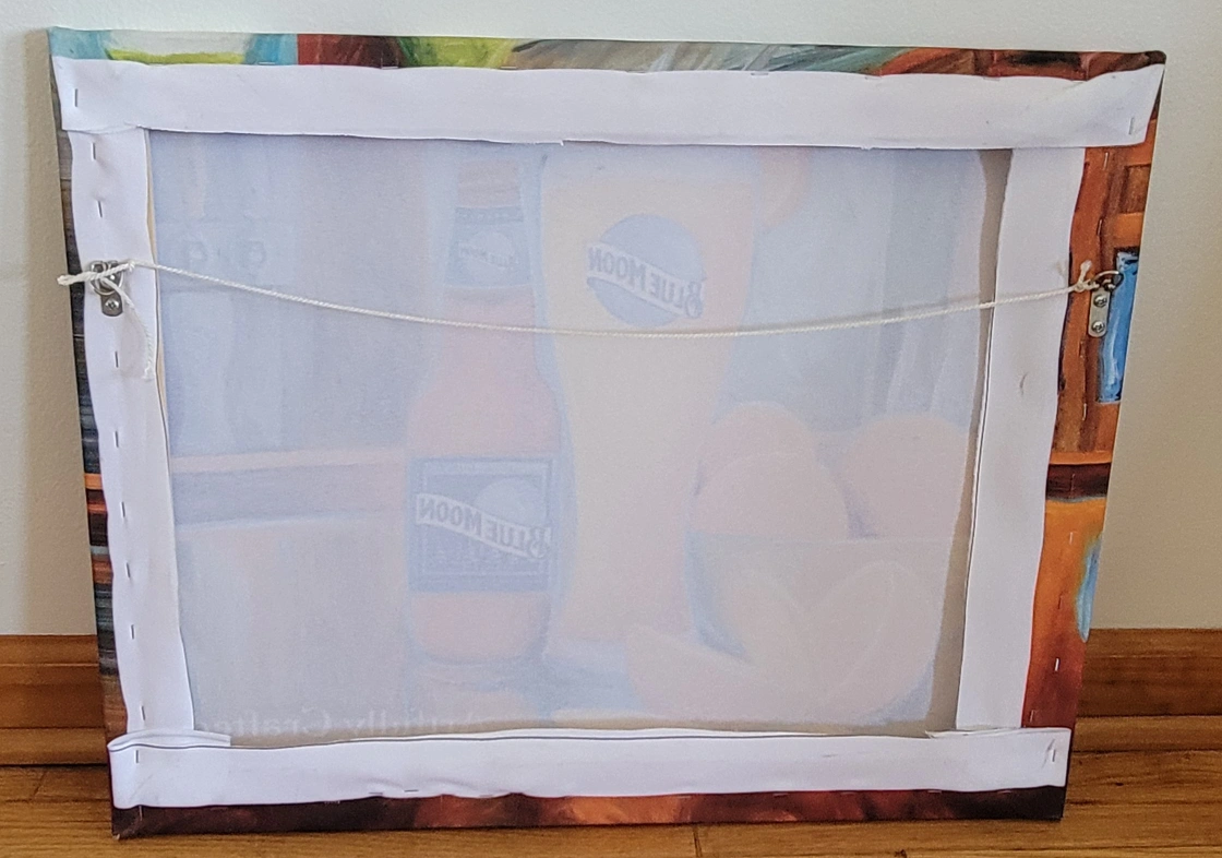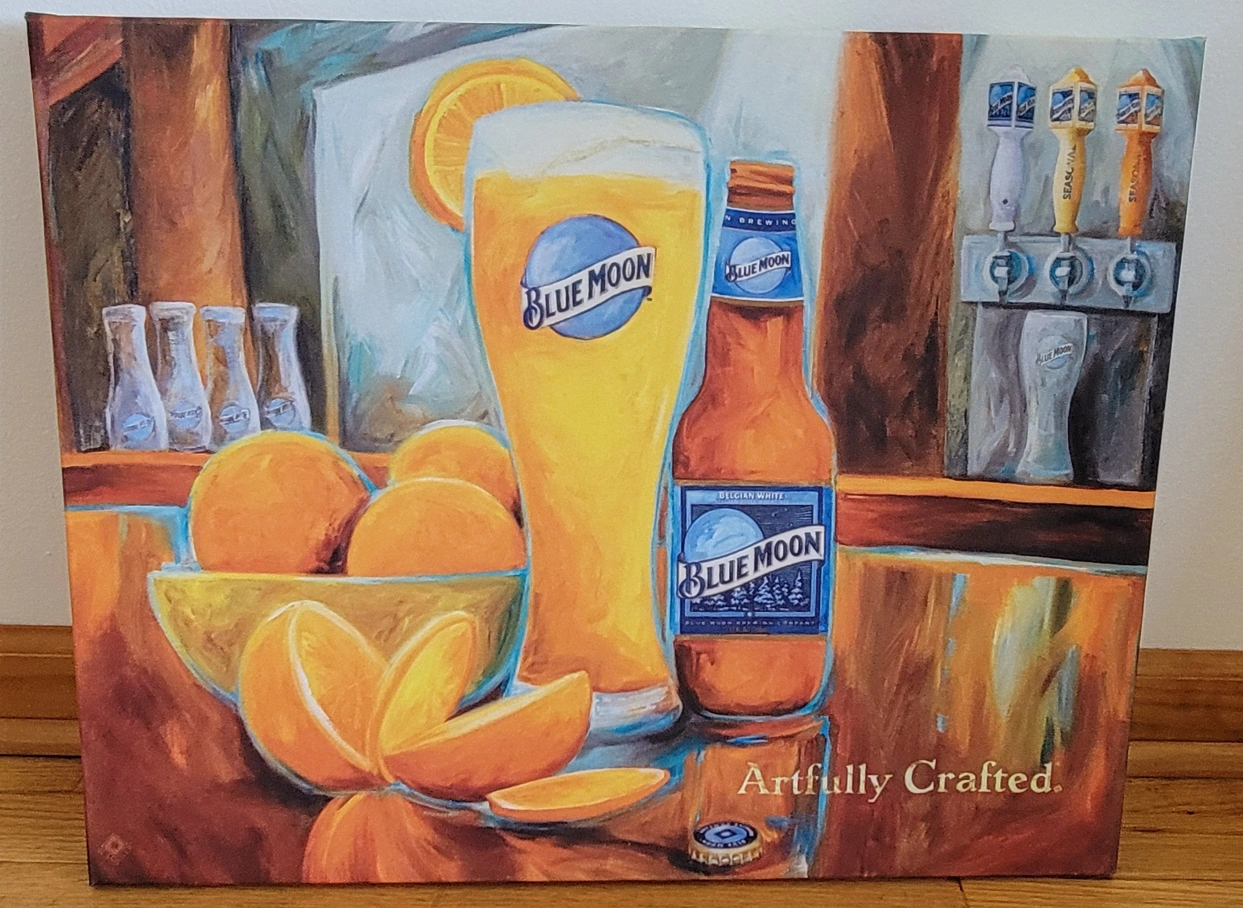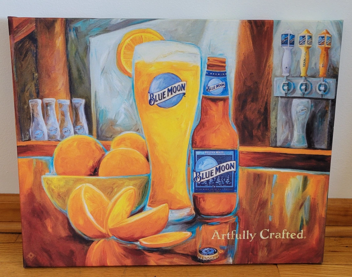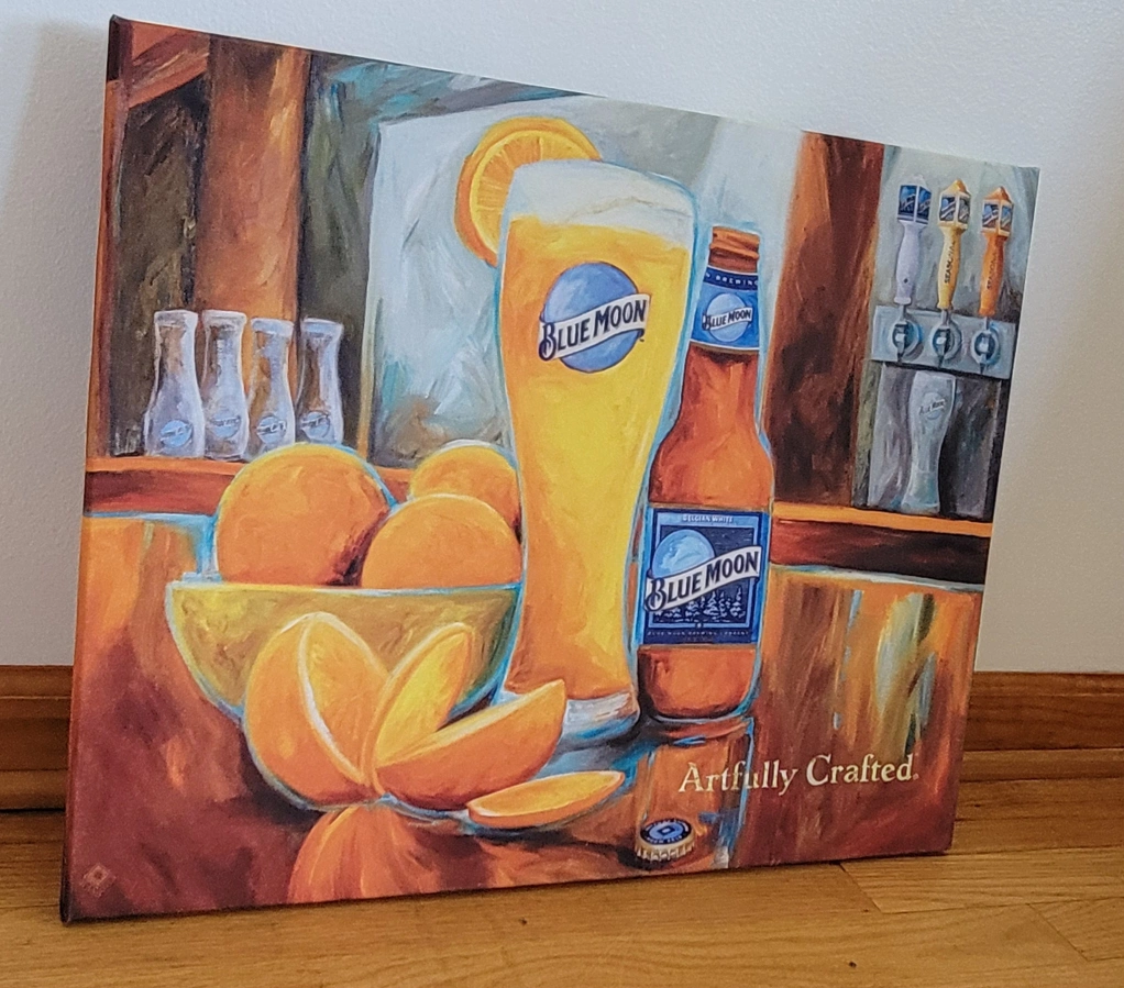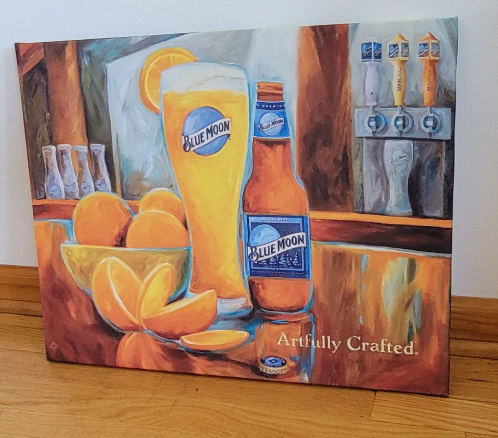 Measures 22" x 18". Here's a vibrant canvas print featuring a Blue Moon beer theme! It showcases a glass of Blue Moon, a bottle, and a bowl of oranges, with the words 'Artfully Crafted' printed on it. Perfect for adding a pop of color to your space. Great condition. Se habla español.