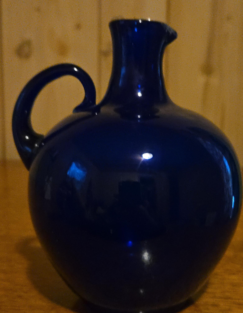 This is a beautiful blue pitcher! It's in great condition and would look lovely in any home. It's perfect for serving water, juice, or any other beverage