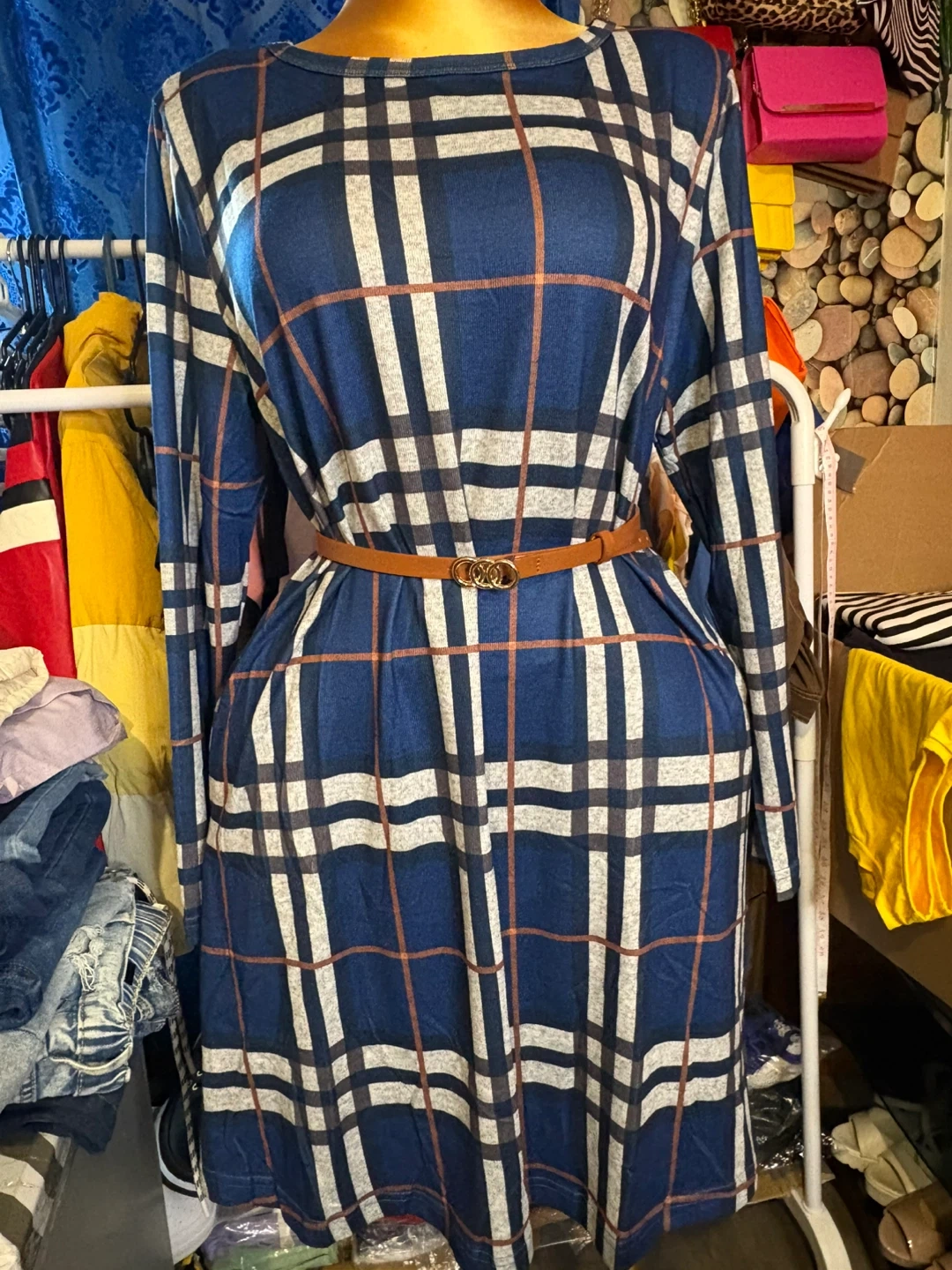 I have a blue plaid long sleeve dress for sale! It comes with a brown belt to cinch the waist. This dress is perfect for a casual day out or a cozy evening in. The material is soft and comfortable, making it a great addition to your wardrobe